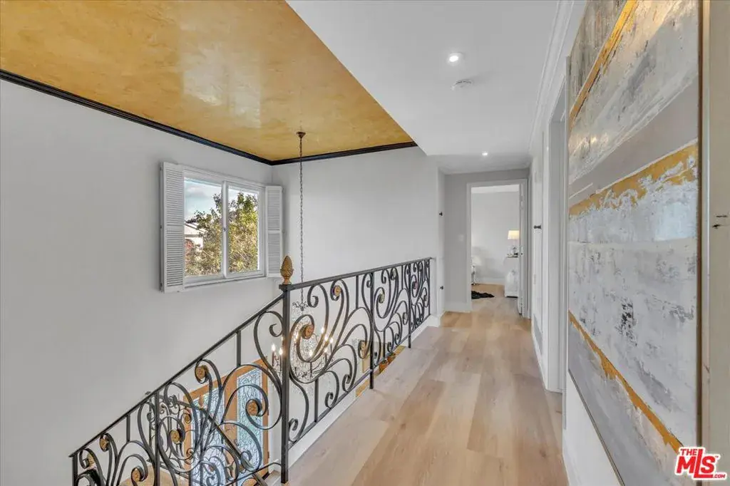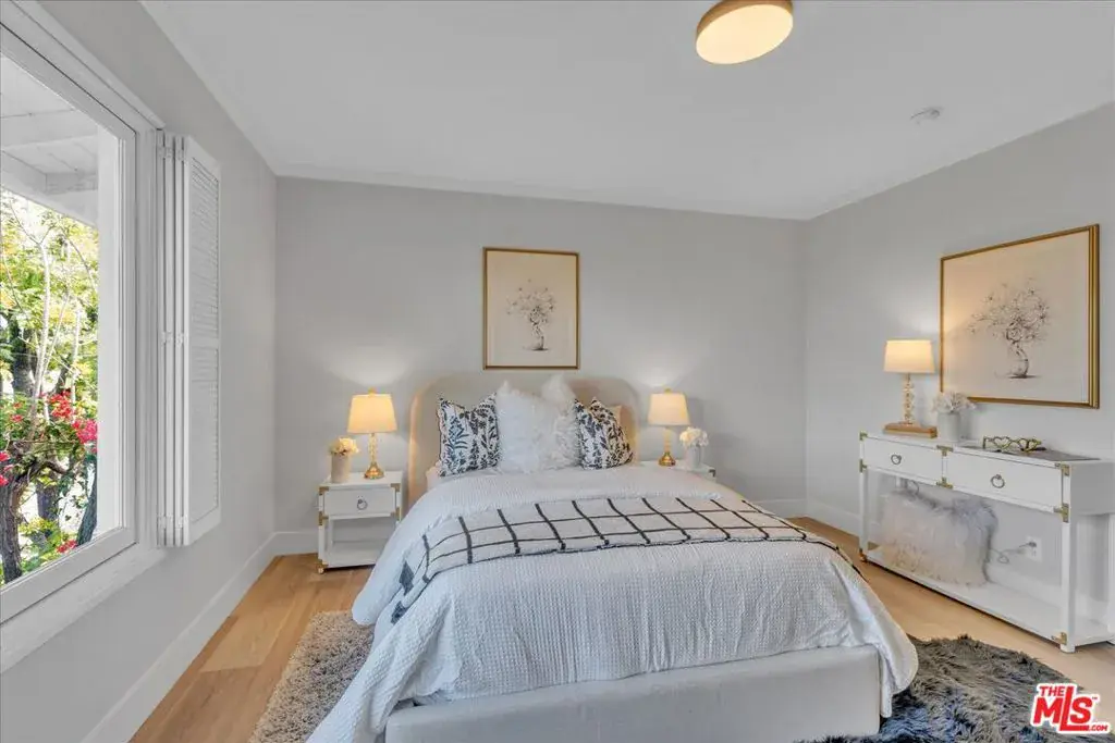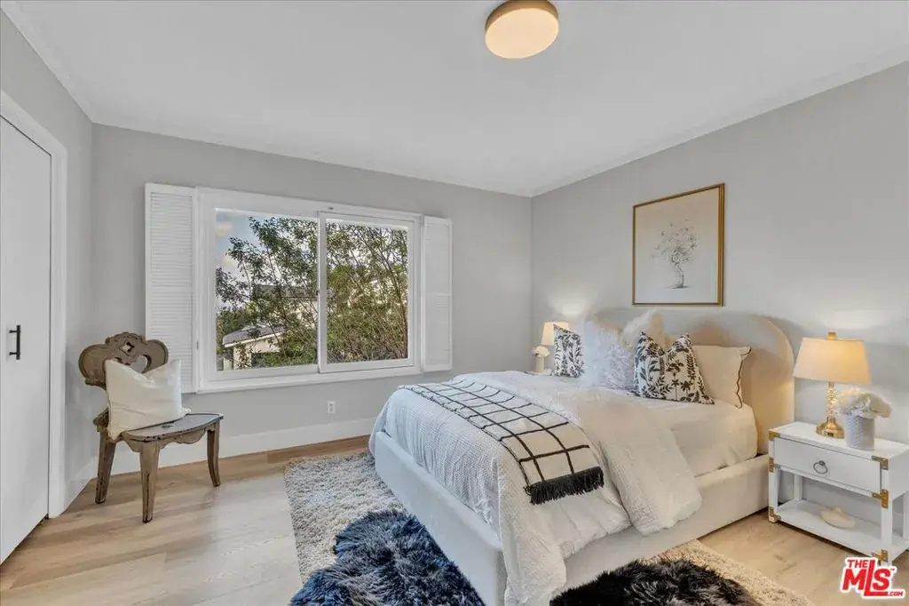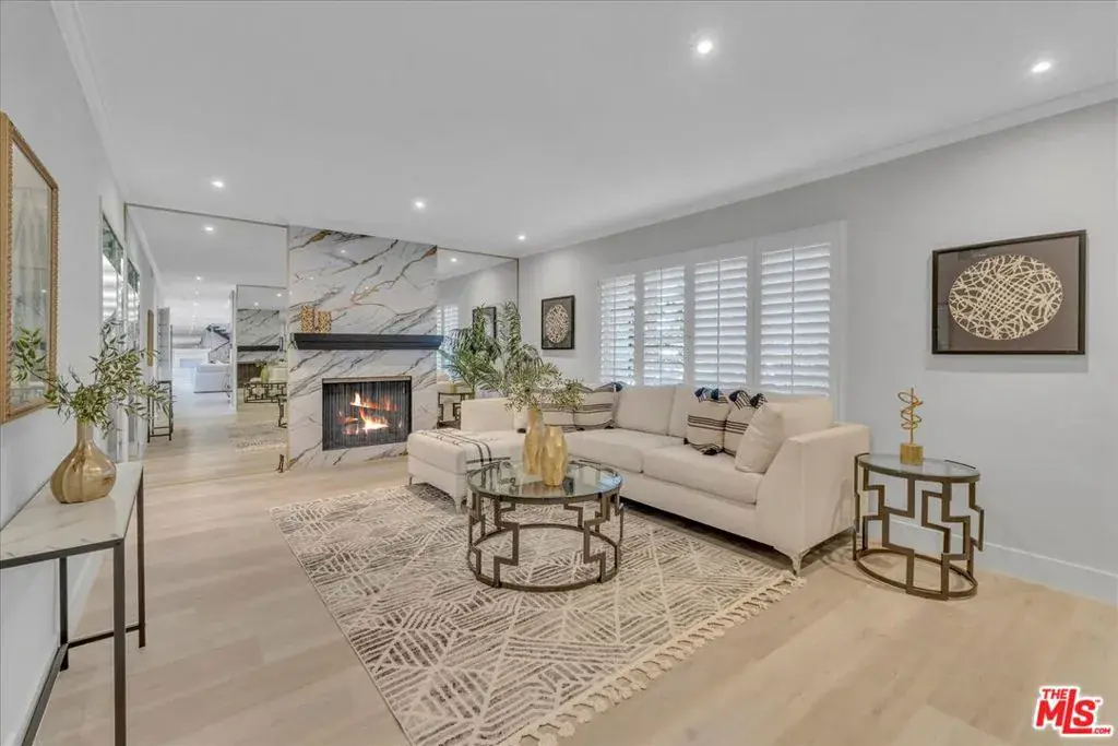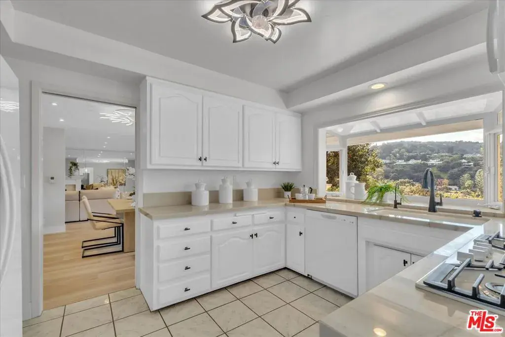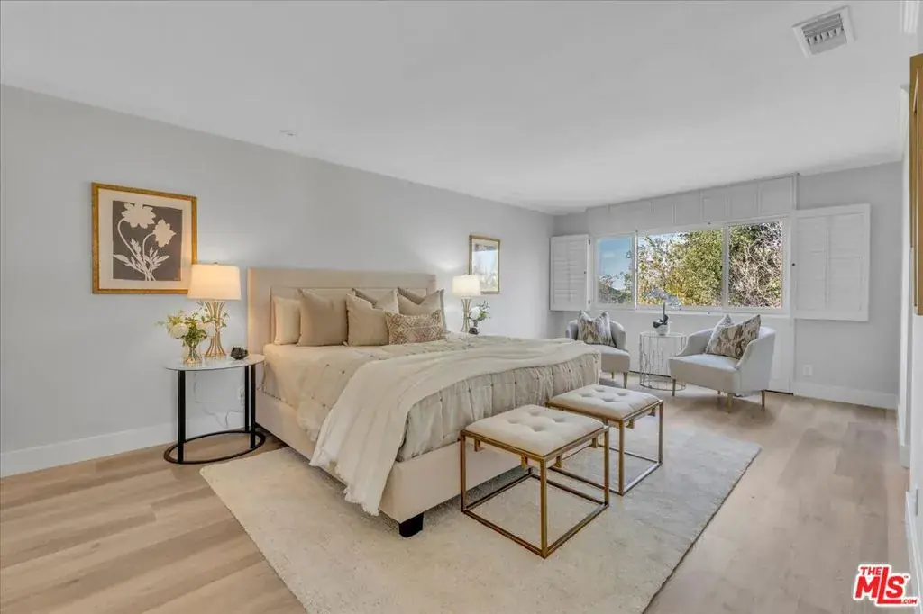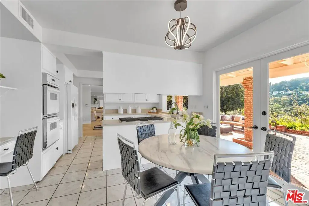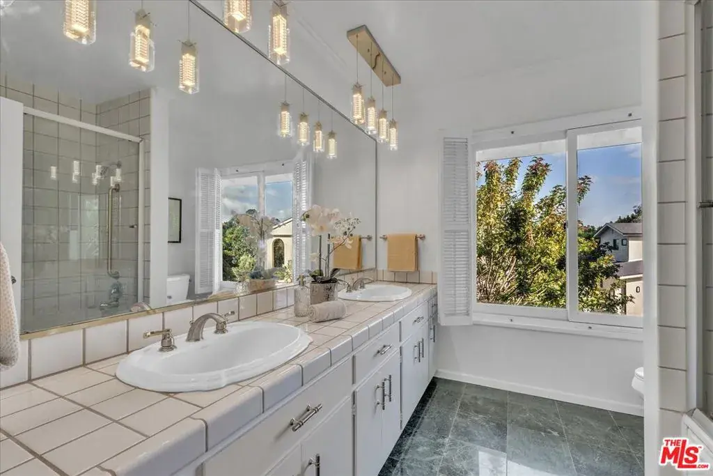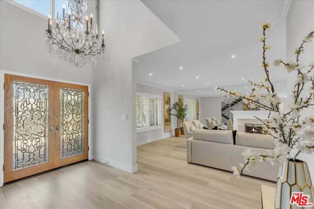Located at the pinnacle of prestigious Encino Hills, just moments from iconic Mulholland Drive, this beautifully reimagined approximately 3,000 sq ft transitional residence sits within the highly desirable Lanai Road Charter School District and is surrounded by multi million dollar estates. Striking curb appeal welcomes you with a charming used-brick driveway and walkway, mature landscaping, and an inviting presence. A dramatic two-story entry opens to light-filled living spaces including a formal living room with fireplace, formal dining area, and an updated kitchen featuring quartzite countertops, breakfast area, and expansive glass doors that create seamless indoor/outdoor flow. The private backyard is ideal for entertaining, offering a full size dark bottom pool, outdoor dining patio, lush grounds, and mountain, treetop, and Valley light views. A spacious family room with a second fireplace sits adjacent to the kitchen. The main level also includes two powder rooms, one with direct pool access, plus an oversized two car attached garage with storage room. Upstairs features four well-appointed bedrooms, all showcasing scenic views. The primary suite includes a sitting area, dual walk-in closets, and a spa inspired bath with dual vanities, soaking tub, and dedicated vanity area. Additional highlights include custom doors and windows, designer lighting, and newer luxury vinyl wood style flooring throughout. With easy Westside access, nearby hiking trails, and exceptional value, this Encino Hills home offers the perfect blend of privacy, comfort, and location.