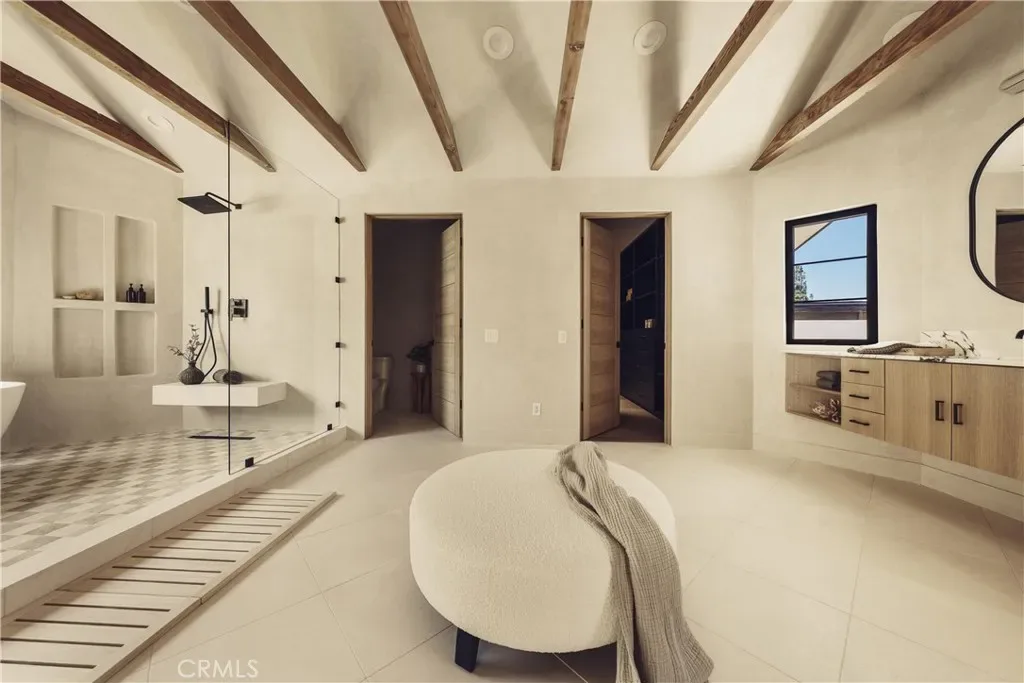 Welcome to this stunning, sprawling residence in the Hills of Encino, offering timeless, luxurious design and exceptional craftsmanship. From the moment you arrive, the smooth stucco façade with limestone accents delivers striking curb appeal. Travertine steps lead you to an impressive ten-foot glass entry door, setting the tone for what awaits inside. The foyer is bathed in natural light, thanks to multiple iron French doors and strategically placed skylights. The great room is anchored by an expansive fluted architectural fireplace, creating a sophisticated, inviting ambiance. Throughout the home, premium finishes, including French oak engineered hardwood flooring. A massive living room faces the backyard seamlessly flows into the chef’s kitchen, highlighted by a large island with fluted wood paneling, abundant white oak cabinetry, top-of-the-line Thermador appliances, and a walk-in pantry for added convenience. Adjacent to the kitchen, a private family room offers a cozy retreat separate from the main entertaining areas. A central hallway leads to two bedrooms, a formal dining room featuring a built-in wine rack, a stylish bathroom, and a utility room with laundry facilities. In the southern wing, you’ll find two en-suite bedrooms and the expansive primary suite overlooking the backyard. The primary bathroom is a showstopper, with dual showers featuring travertine checkered floors, limestone flooring, and a custom dual vanity topped with Arabescato Corchia marble. The custom walk-in closet provides generous storage and organization. The low-maintenance backyard is perfect for entertaining, with travertine flooring throughout, a large pool and spa, built-in barbecue, and integrated speakers. An additional spacious side yard features a pergola-covered patio with peek-a-boo views. For added convenience, there is an additional bathroom with access from the side yard for those using the pool. This home offers a luxurious, timeless aesthetic sure to impress, all within close proximity to the best shopping and dining the Valley has to offer.