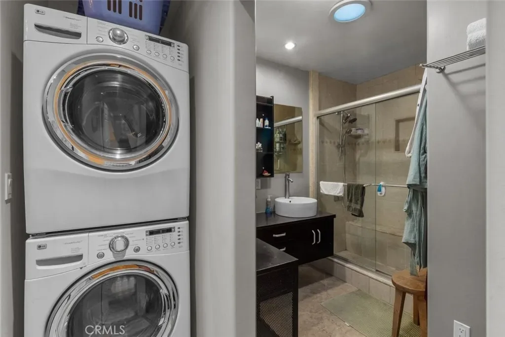 Inviting living room with fireplace and recessed lighting, private deck, and galley kitchen with black granite counters, black tile backsplash, and modern appliances. Primary bedroom includes a ¾ bath with dual sinks, walk-in shower, and in-unit laundry. Second bedroom offers deck access—ideal for office or guest use.