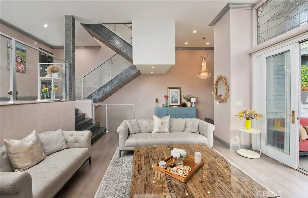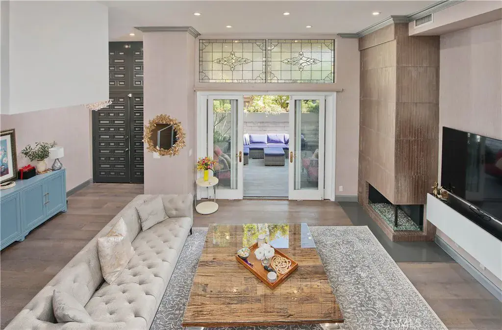 Sophisticated living awaits in this stunning residence ideally situated in a quiet interior location within the highly coveted Encino Spa community. Showcasing soaring ceilings, gleaming wood floors, and beautifully curated designer finishes, this exceptional home offers a refined blend of comfort and contemporary style. A dramatic double-door entry opens to expansive living spaces filled with natural light. The elegant living room is anchored by a striking fireplace and framed by floor-to-ceiling windows that seamlessly connect to the private entertainer’s patio—creating the perfect setting for indoor-outdoor living. At the heart of the home is the beautifully designed chef’s kitchen, featuring sleek custom cabinetry, quartz countertops, stainless steel appliances, glass tile backsplash, and a sunlit casual dining area ideal for everyday living. The residence offers three generously sized bedrooms, highlighted by the impressive primary suite with soaring ceilings, sitting lounge, private balcony, and an expansive dressing area with both walk-in and wardrobe closets. The spa-inspired primary bath features dual vanities, a jetted soaking tub, and an oversized seamless glass shower.