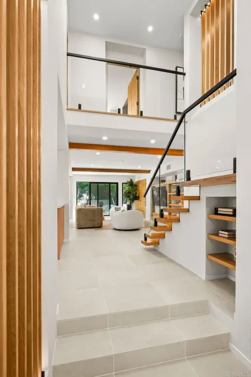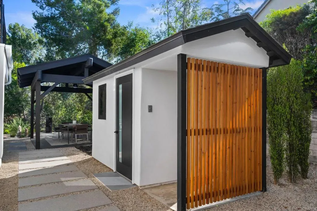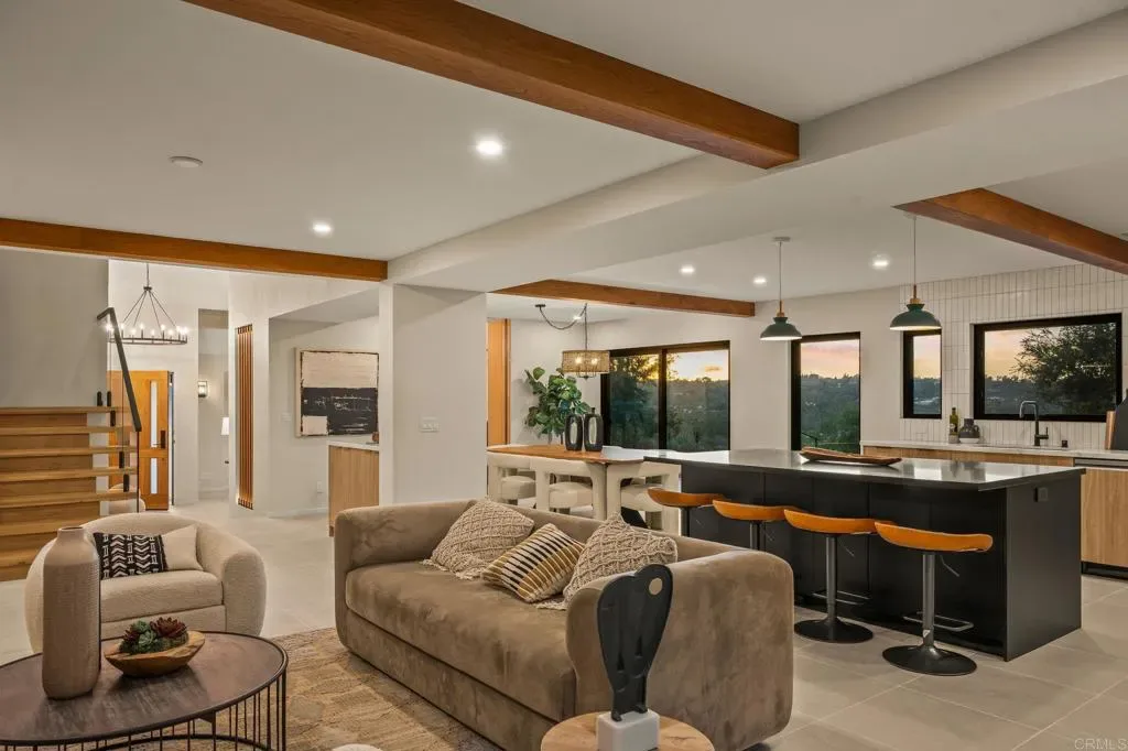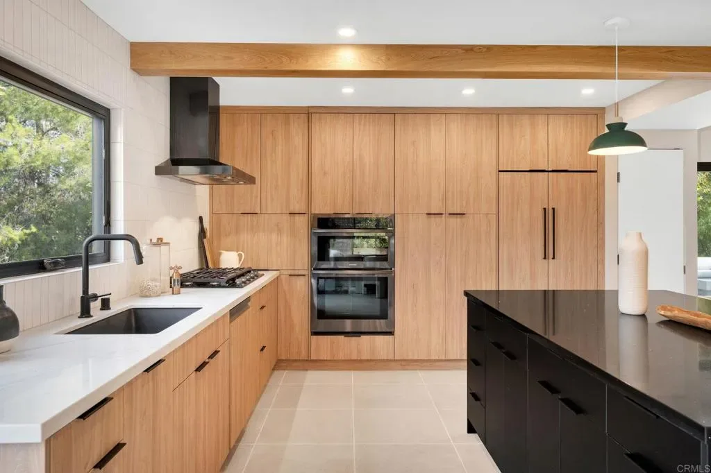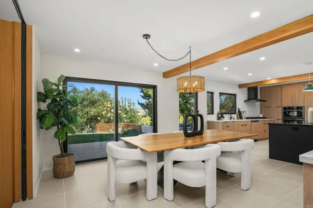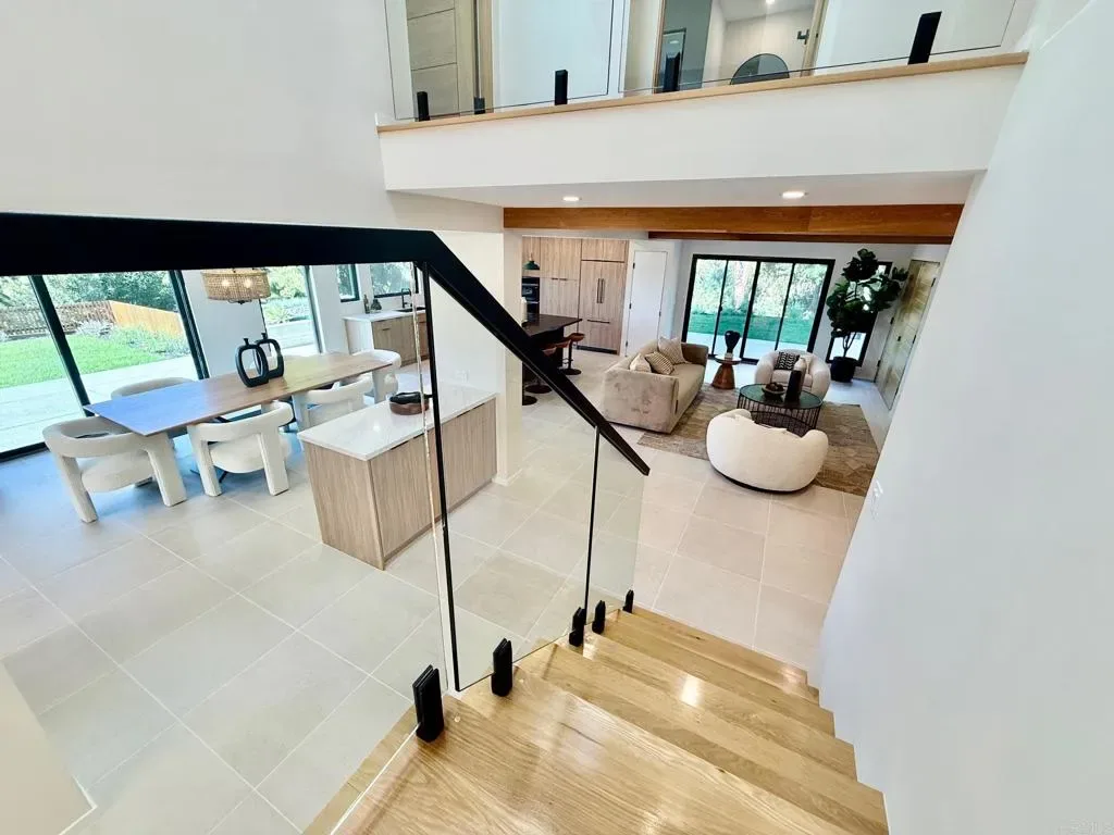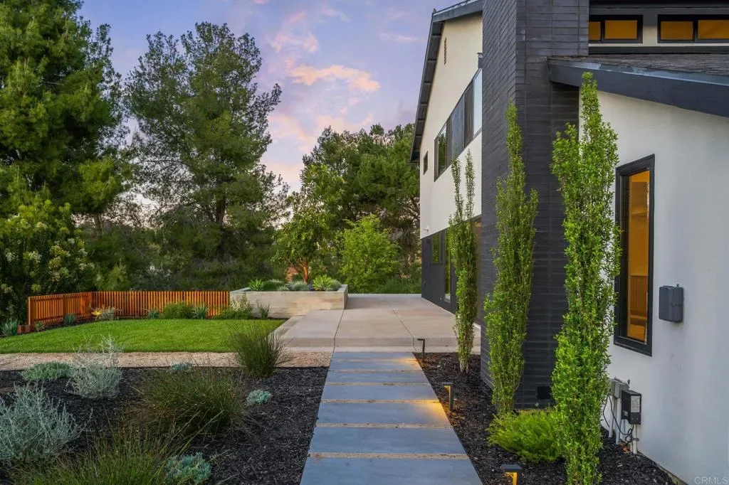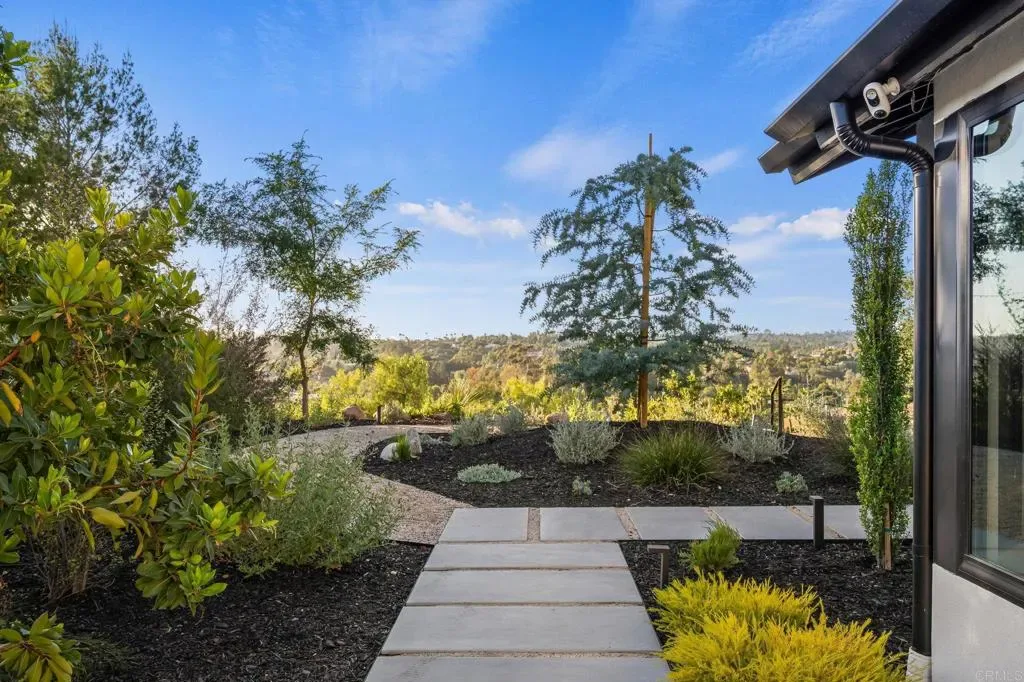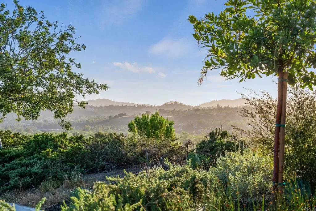 Experience elevated living at a sophisticated luxury residence framed by panoramic views over Southwest Escondido in the hills above Bear Valley. Four bedroom, three bath home has been completely transformed through an extensive remodel where every surface was touched, delivering a bright, move-in-ready sanctuary that has never been lived in since completion. Custom cabinetry, white oak woodwork, quartz countertops, black-framed windows and doors, and seamless indoor-outdoor flow, the open-concept spaces are flooded with natural light. Designed for entertaining, the gourmet kitchen opens to dining and living areas that effortlessly connect to the outdoors. The primary suite offers serene views, a spa-like bath with dual vanities and a luxurious walk-in shower, plus a custom closet. Unwind in the private cedar sauna for ultimate wellness. Additional highlights include a dramatic two-story open stairwell with glass railing, a built-in media wall, and abundant storage throughout. Outside, enjoy resort-style grounds at the end of a quiet cul-de-sac on 1.42 private acres. New hardscape, mature low-maintenance landscaping, fire pit seating, a covered patio with wood slat privacy screen, and a soothing water feature create the perfect setting. Owned solar panels on the new roof deliver energy efficiency and significant monthly savings. This rare, truly custom high-end offering combines privacy, fine architectural details, panoramic views, and turnkey luxury.