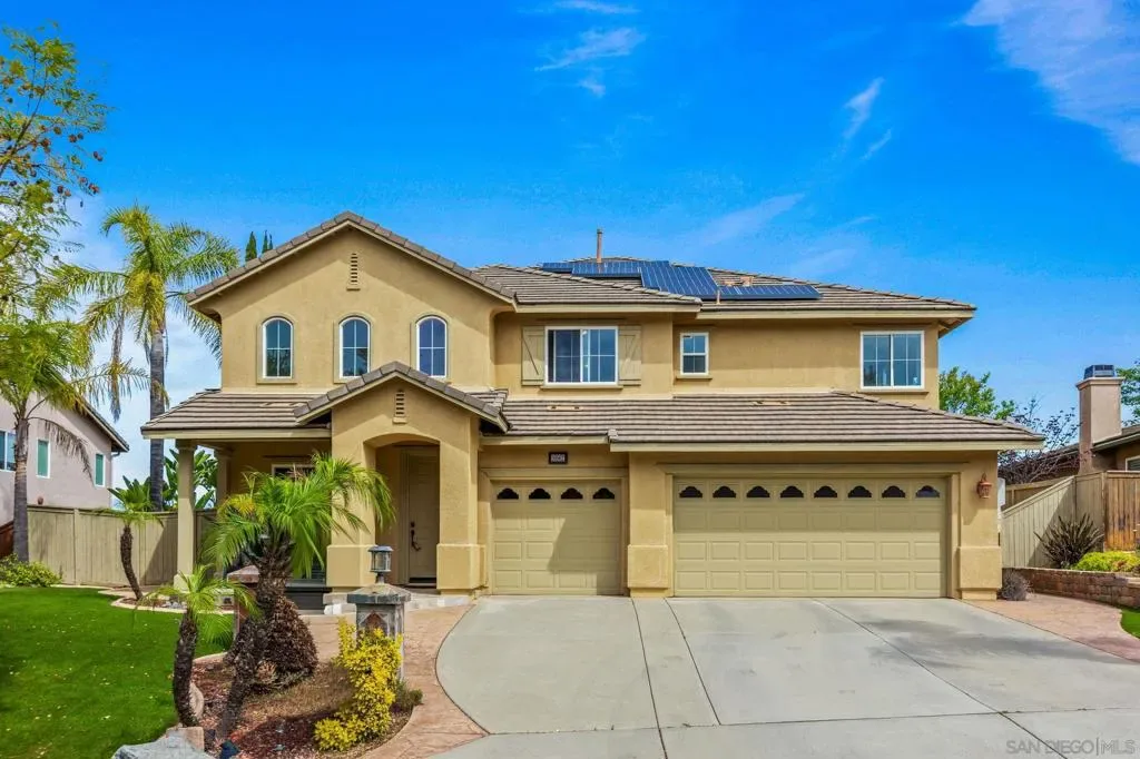 Owned Solar! Views! EV Ready! Stunning 5BR/3BA home in Hidden Meadows featuring soaring ceilings and panoramic golf course/hillside views. Modern layout includes a gourmet granite kitchen, entry-level bed/bath, entry-level bedroom, entry-level office and a spacious family room with custom built-ins. Huge primary suite offers a private fireplace and dual closets. 4 Low-maintenance yard, 220V EV charger, and fully owned solar. Enjoy resort-style living with community pools, tennis, golf, and clubhouse. Your North County retreat awaits!