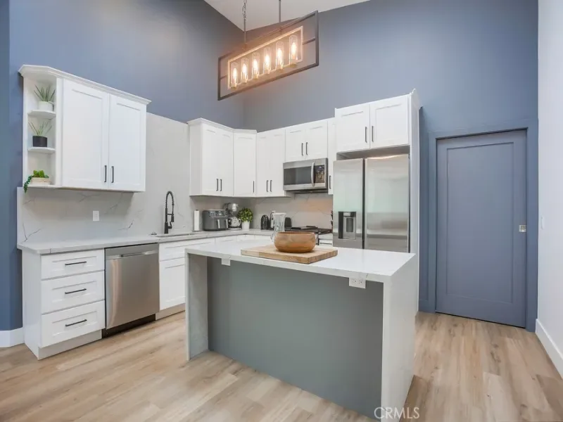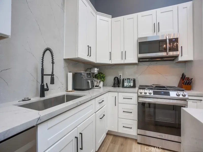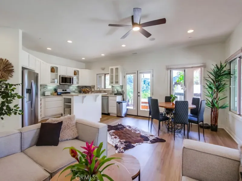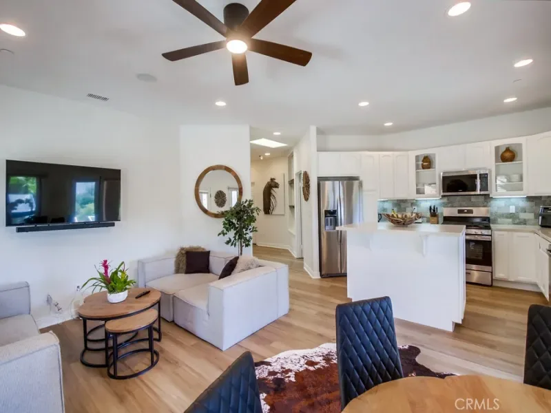 The permitted detached guest home (approx. 1,200 sq ft, 2 bed / 2 bath) offers a comfortable and private living environment with neutral finishes, luxury vinyl plank flooring, Corian kitchen countertops, stainless steel appliances, ample cabinetry, its own laundry room, and a covered carport area.
