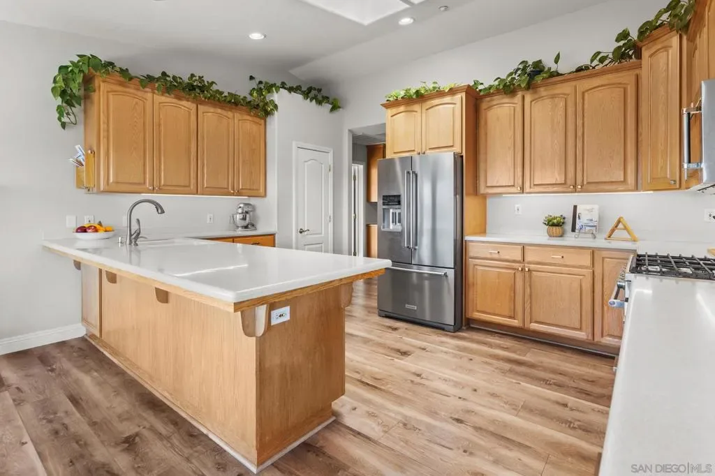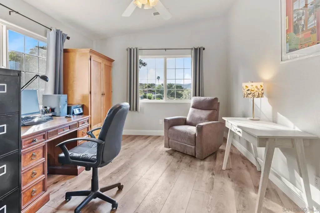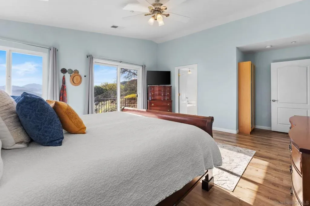 Perched above South Escondido on nearly 1 acre of land, this 2001 custom built Lake Hodges estate offers unparalleled panoramic views from every room. The expansive outdoor areas and the 3299 sq ft home are an entertainers dream with breath taking scenery always in sight. For multi-generational living or rental potential, the lower level features a separate living space with a private entrance, one bedroom plus an optional second, a full bath, and a kitchenette already plumbed for a full conversion. The home is filled with ambient light, creating a warm and airy atmosphere throughout its versatile floor plan, which features three spacious bedrooms plus two optional rooms perfectly suited for an office, gym, or nursery. At the heart of the home, the kitchen is a chef’s delight, boasting newer appliances, extensive cabinetry and counter space, and a walk-in pantry. It flows seamlessly into a sun-drenched eat-in nook for casual dining. The primary suite serves as a true sanctuary, complete with vaulted ceilings and a private slider leading to a view deck. Its ensuite bathroom provides a spa-like experience with a separate soaking tub, walk-in shower, private commode, and a walk-in closet. Adjacent is the spacious laundry room with plenty of storage and cabinets. The property’s outdoor oasis includes 5 distinct seating areas, an in-ground pool and spa, supported by 2 owned solar systems, one for electricity and one that heats the pool water for year-round enjoyment. Completing the home is an oversized three-car garage with ample storage and a dedicated workspace area.