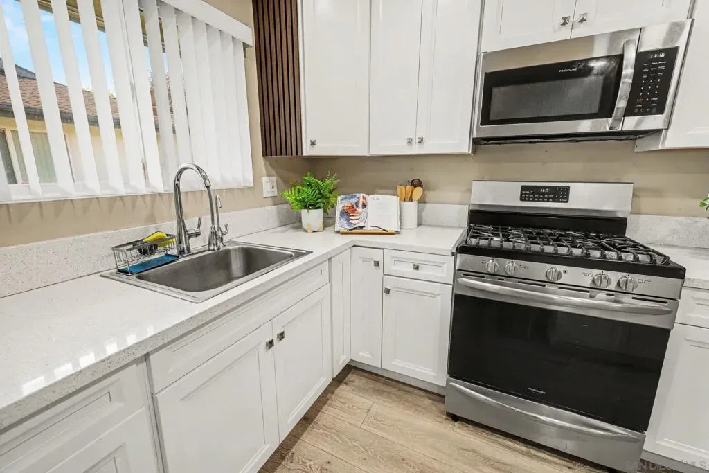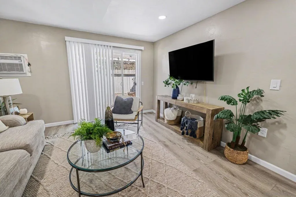 Beautiful single-story, end-unit condo offering the perfect blend of modern upgrades and privacy. Completely renovated from top to bottom by the seller, with no neighbors on one side and no direct frontage, it feels like a detached home—perfect for first-time buyers, investors, or those looking to downsize.The redesigned kitchen layout is a true centerpiece, featuring a center island, quartz countertops, and stainless steel appliances. Stylishly updated bathrooms, new luxury vinyl plank flooring, fresh paint, and a cozy living room with a fireplace opening to a private patio complete the space. Extras include an in-unit washer/dryer, window A/C, newer furnace, and a one-car garage with storage. Steps from the pool and spa, with nearby shopping, dining, and easy freeway access (CA-78). VA-approved and move-in ready—don’t miss out!