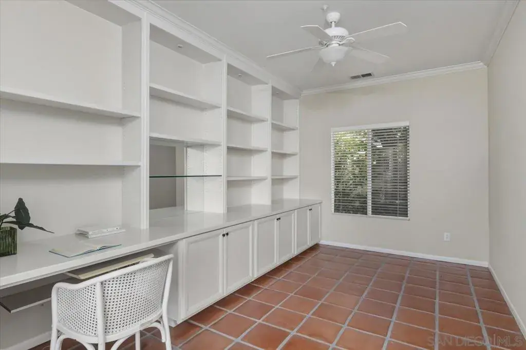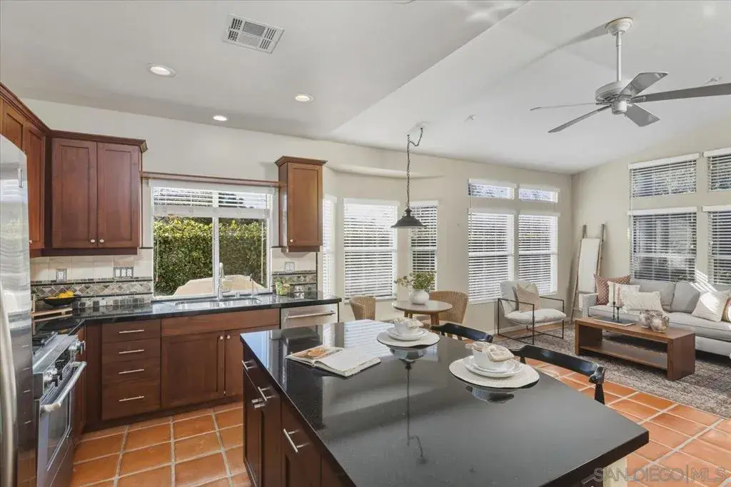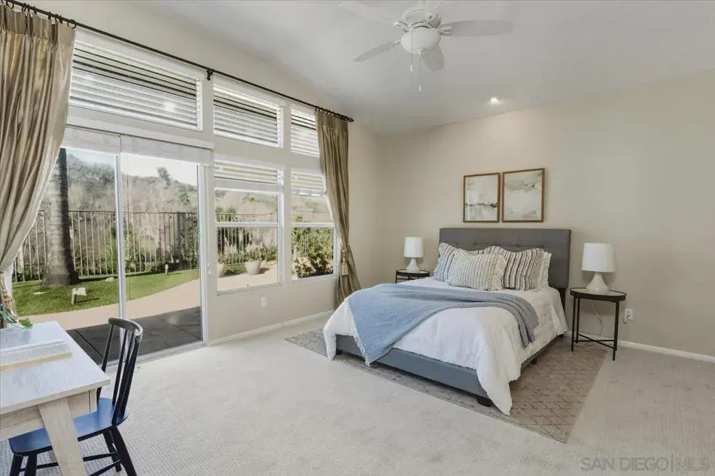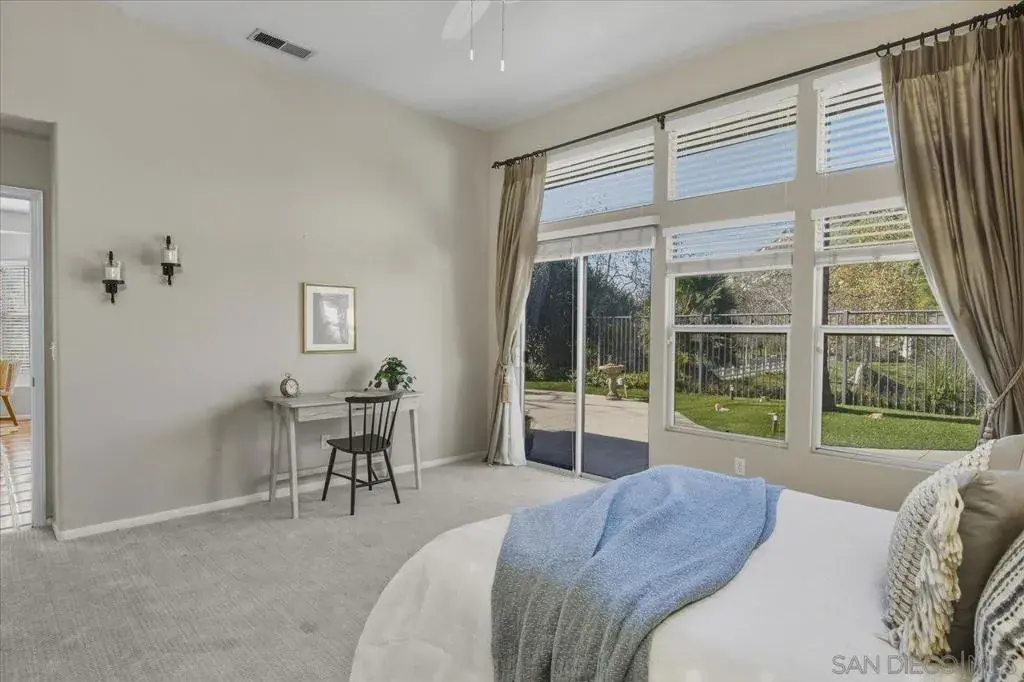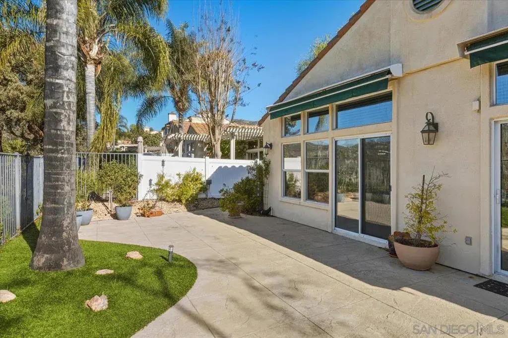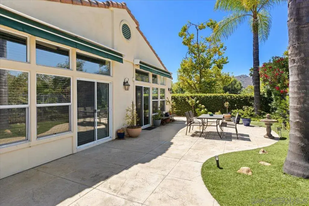 BACK ON MARKET! Immaculate single-story home with expansive views of the golf course, pond, and sunsets, located in the gated community of Rancho San Pasqual, part of the Dos Osos Golf Club. Ideally situated on a corner lot offering extra privacy and just a short distance from the community clubhouse with pool, spa, sport court, BBQ and picnic area, and playground. The home has been thoughtfully upgraded with fully owned solar, stainless steel appliances, granite countertops, stone tile backsplash, updated cabinet doors, newer sink and garbage disposal in the kitchen. The family room includes built-in shelving, custom fireplace doors, and a redesigned mantel. The primary suite features new carpet and a remodeled en-suite bathroom with granite countertops, updated faucets, dual sinks, framed mirrors, lighting, toilet, and a walk-in glass shower with decorative tile accents. One secondary bedroom has been converted into a den or office with built-in shelving, pull-out drawers, glass shelving, and mirrored backing. Additional updates include a newer A/C unit, Saltillo tile flooring, updated molding, ceiling fans, window coverings, interior lighting fixtures, and fresh paint throughout. The front and backyard have low-maintenance artificial turf, a tiled patio, retractable awning, outdoor lighting, flowering trees and plants, and elevated golf course views. The home also features an oversized two-car garage offering additional space for storage or work area. Rancho San Pasqual is a private gated community, conveniently located near schools, wineries CONT. golf courses, the San Diego Zoo Safari Park, shopping, dining, and other North County amenities.