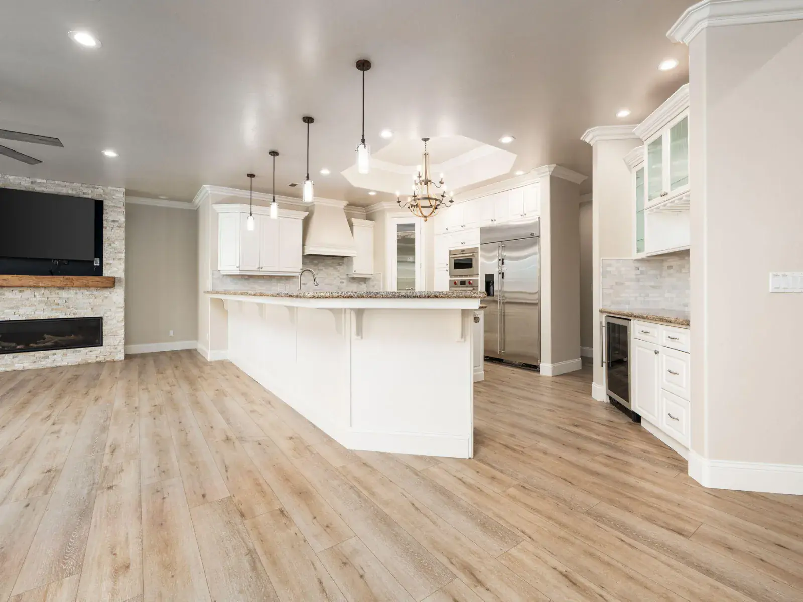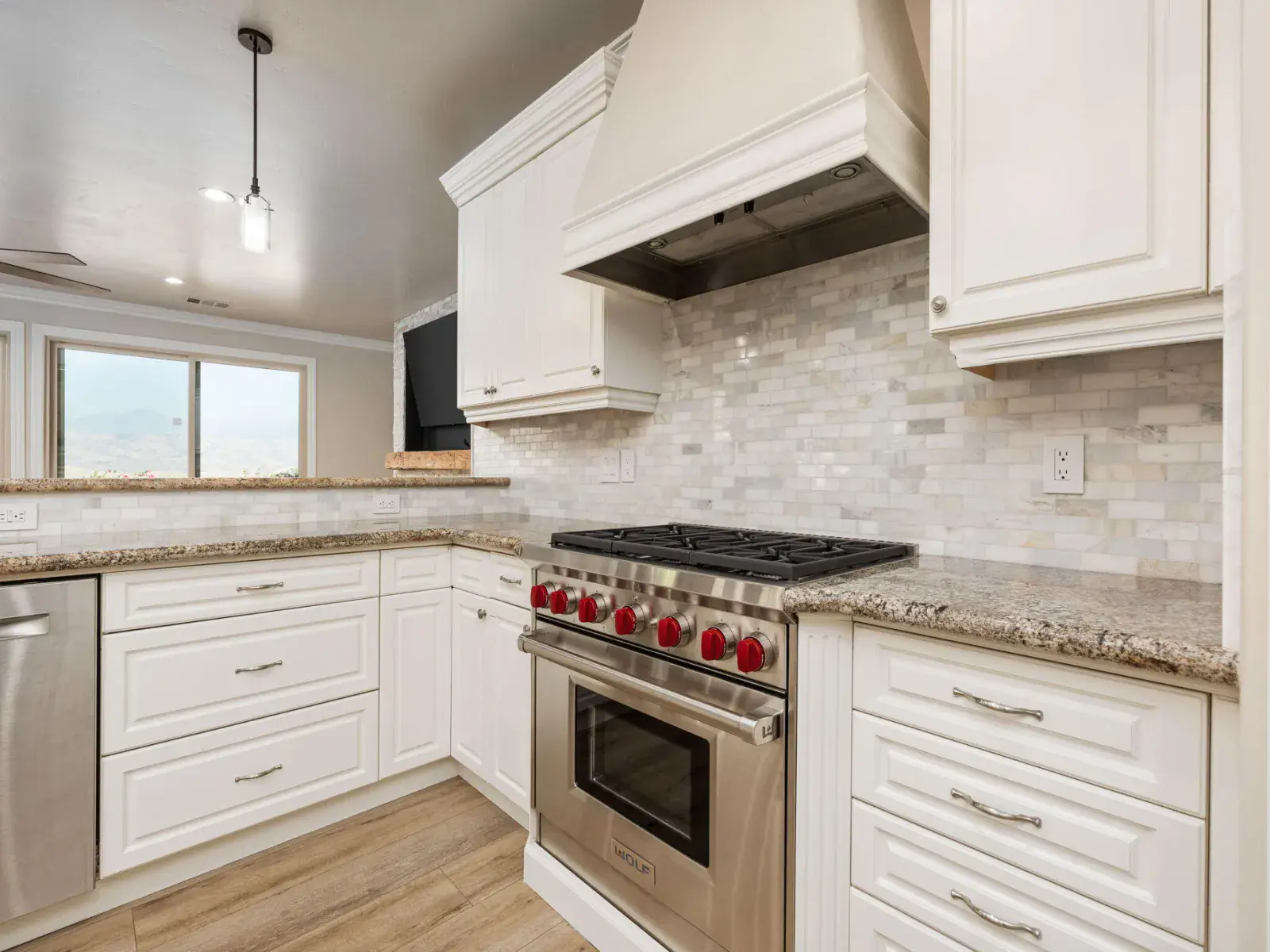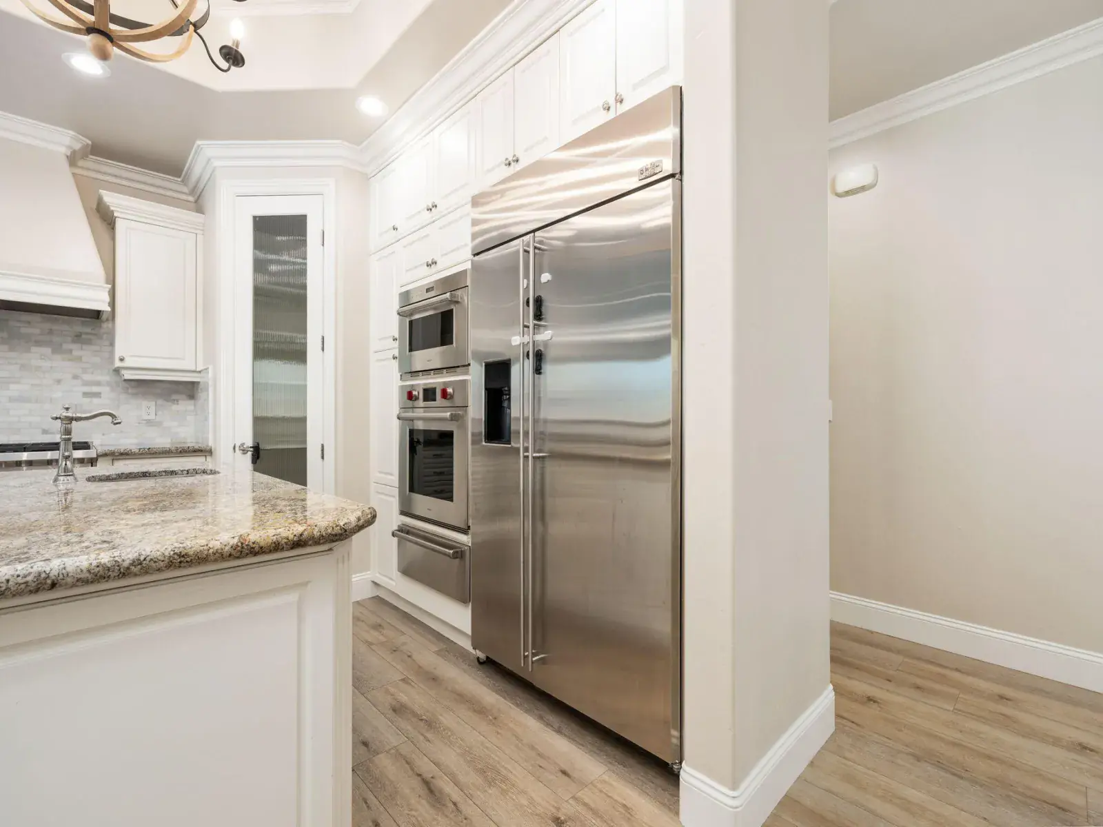 This home offers 3 bedrooms, 3 bathrooms, an office, and a spacious laundry room, all crafted with exceptional detail. At the heart of the home is the gourmet chef’s kitchen—featuring granite countertops, high-end appliances, double ovens, a warming drawer, professional built-in refrigerator, instant hot water, abundant cabinetry, and a bar area with wine refrigerator for effortless entertaining.