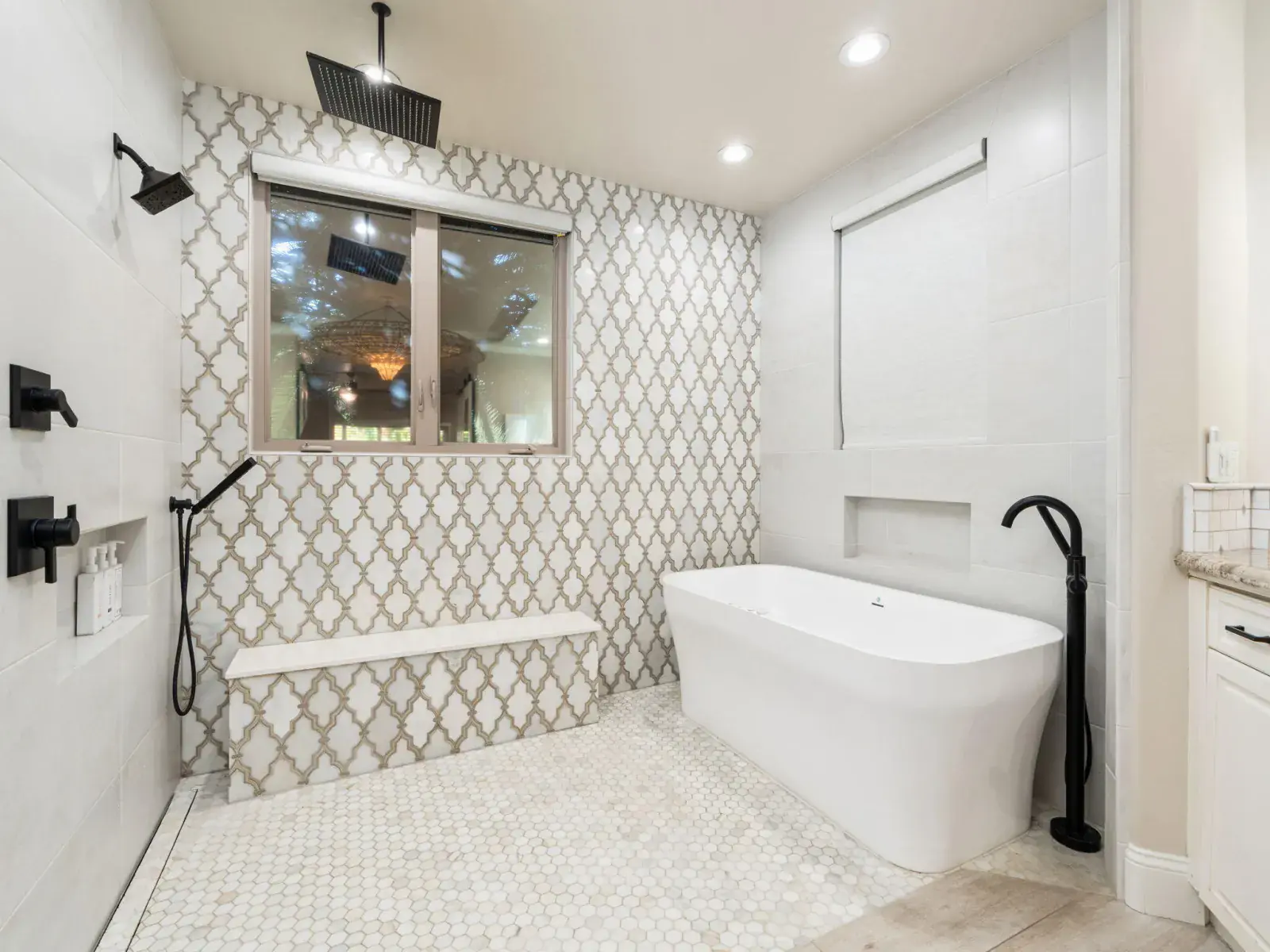 Outside, your private resort awaits with a vanishing-edge pool, spa, gas fire pit, tiki torches, and fire bowls—all operated with a single switch. Heated walkways lead to the covered outdoor bar and kitchen with refrigerator, ice machine, TV, and natural-gas BBQ hookups. Landscaping is maintained on timers for easy upkeep.