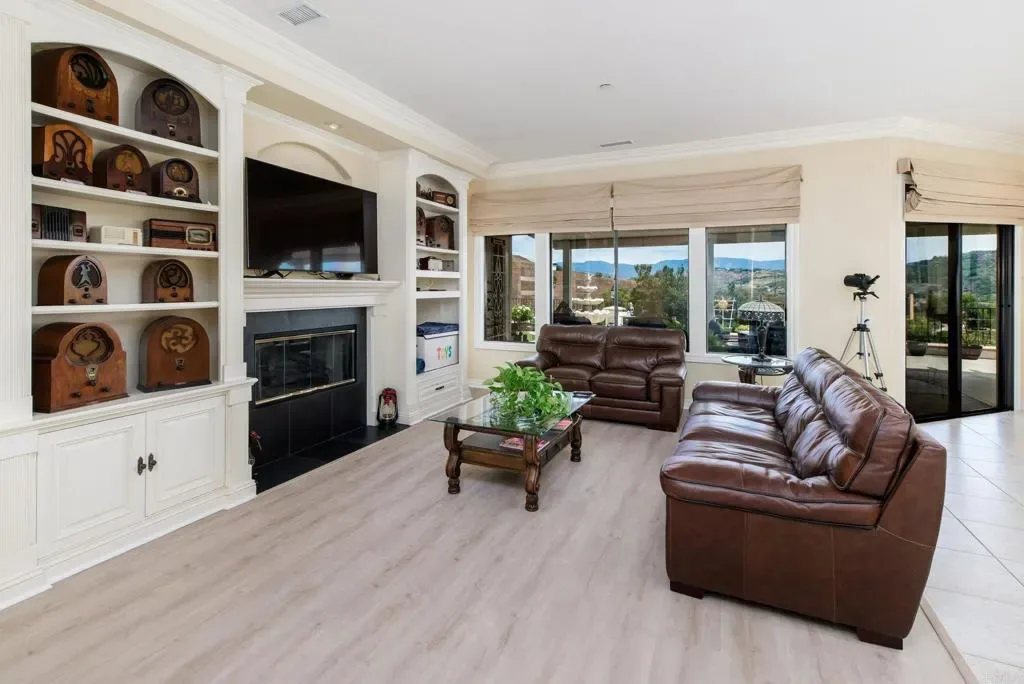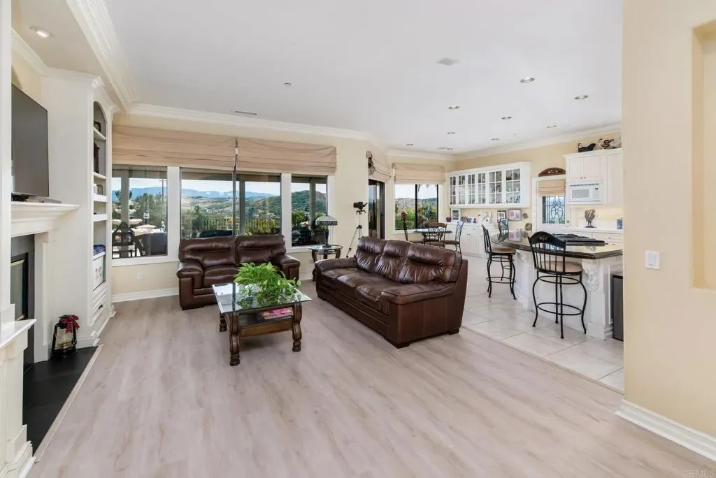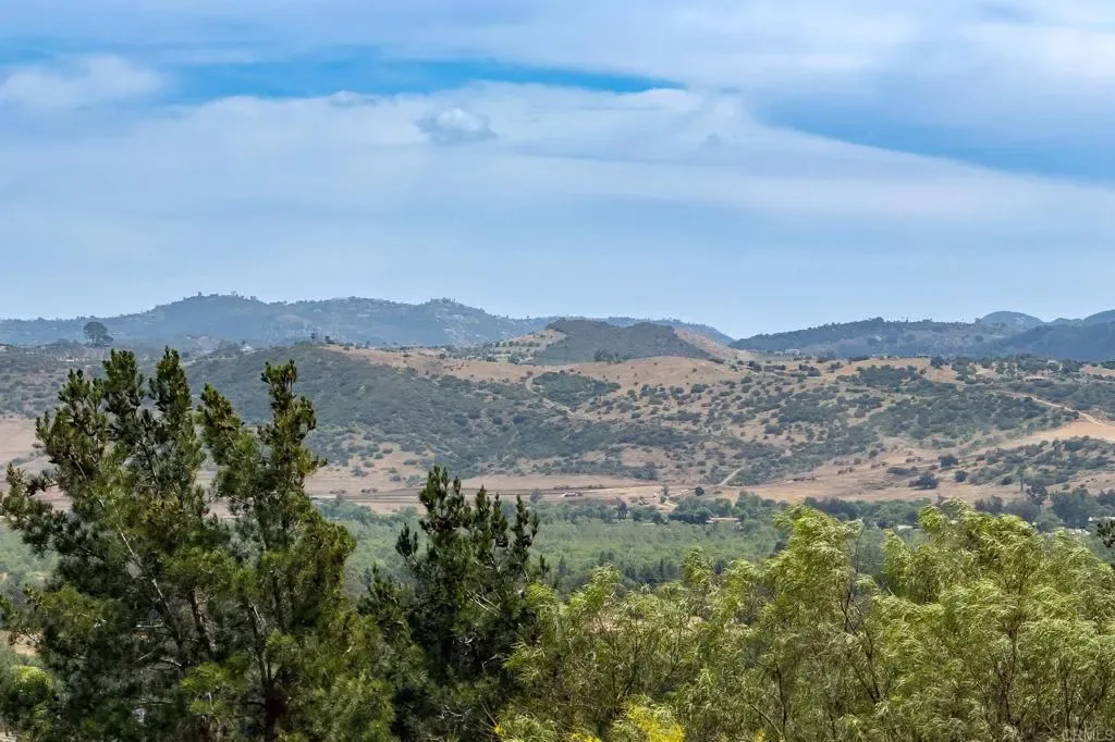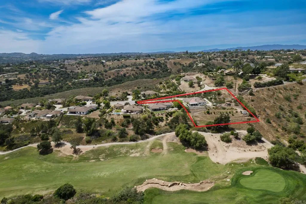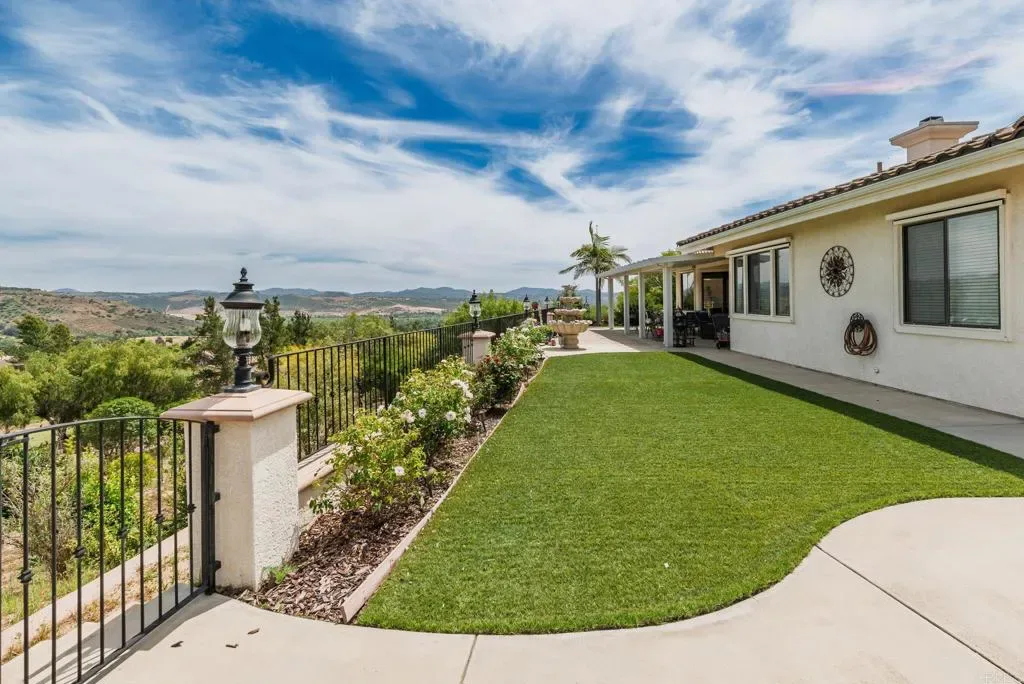 Beautifully maintained 4-bedroom, 2.5-bath, 2,810 SF, Single story home ideally positioned on 1.59 acres above the 6th green of the Golf Club of California, offering stunning views of the golf course, surrounding hills, mountains, and valley. This thoughtfully designed home features 10-foot ceilings, wide crown molding, and elegant wainscoting, creating a refined yet comfortable living environment. Unlike many Fallbrook homes that are on septic and use propane, this home is connected to sewer and SDGE utilities. The spacious kitchen is equipped with a custom black granite island, recently refaced cabinetry, a decorative glass pantry door, and premium Jenn-Air appliances including a cooktop, double oven, and microwave. A cozy breakfast area overlooks the golf course, while the adjacent dining space accommodates a large table perfect for entertaining. The living room showcases a fireplace upgraded with gas logs and glass doors, while new vinyl plank flooring flows throughout the main living areas, complemented by tile in the kitchen, bathrooms, and laundry room. The generous primary suite offers a private retreat with space for a sitting area, custom built-in cabinetry, and direct access to the backyard patio. The en-suite bath includes a soaking tub, glass-enclosed shower, dual sinks, and a spacious mirrored closet. Stay cool with the newer 11/23 central AC and heat. Outdoor features include a flat, usable area around the home with additional terraced land ideal for gardening, fruit trees, or future expansion such as a pool or casita. The backyard is enhanced with wrought iron railings, masonry accents, carriage lighting, and multiple gated access points. The property is not fully fenced. A 10×12 storage shed provides additional functionality. Additional highlights include an attached 3-car garage, expansive driveway for additional parking, interior laundry room with storage and utility sink, security screen doors, and three exterior security cameras. The long driveway is lined with irrigated landscaping, supported by dual sprinkler systems. Located in a desirable golf course community that is public with access to a clubhouse and on-site dining, this home offers a perfect blend of privacy, scenic beauty, and convenience.