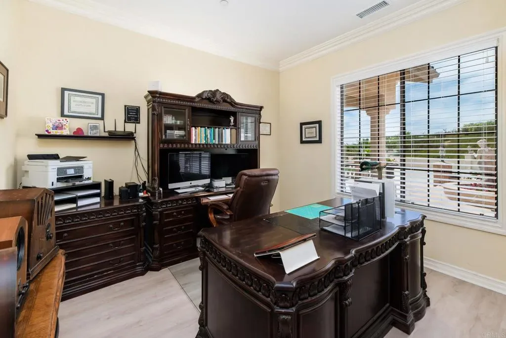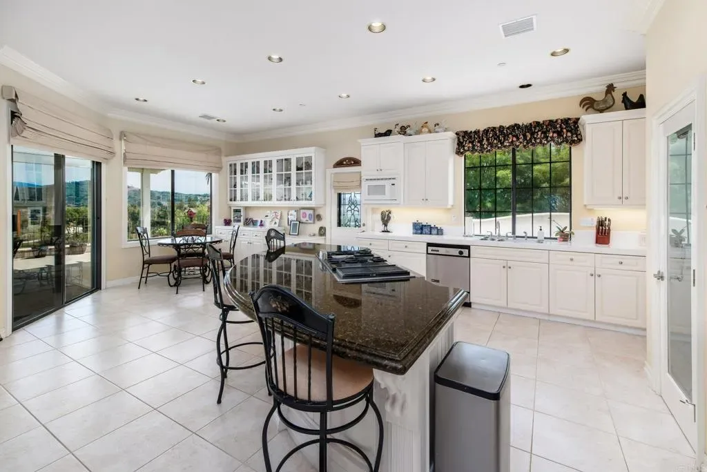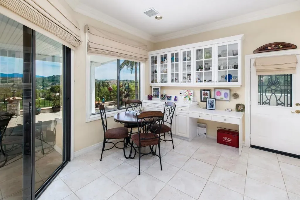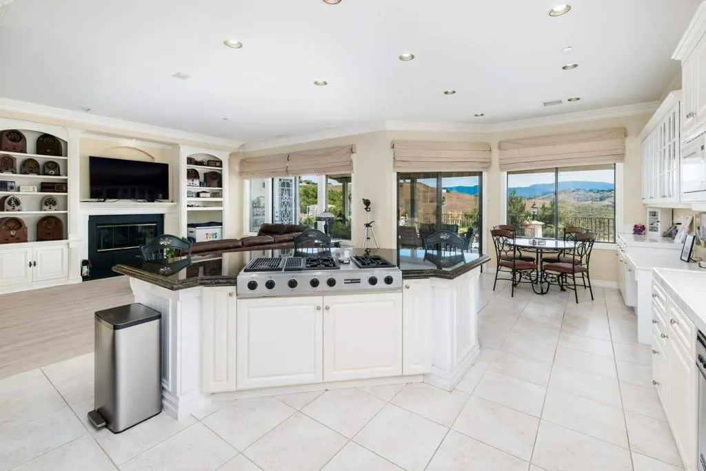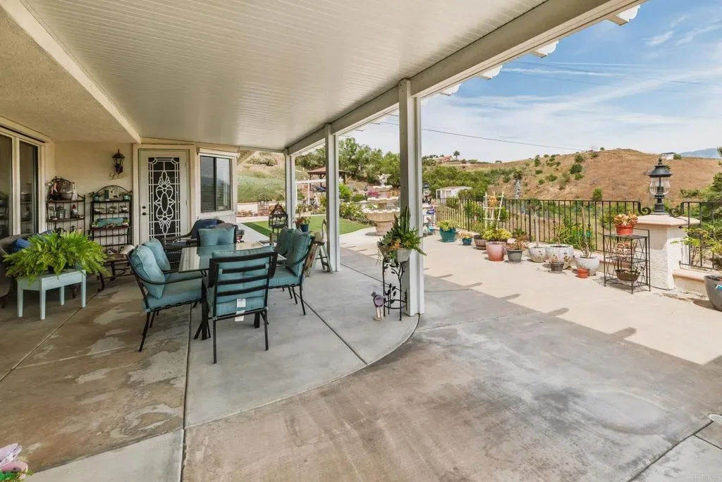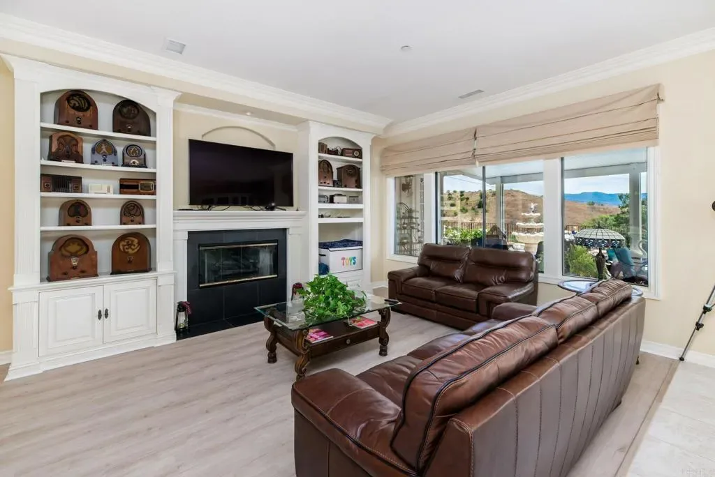 Beautifully maintained 4-bedroom, 2.5-bath, 2,810 SF, Single story home ideally positioned on 1.59 acres above the 6th green of the Golf Club of California, offering stunning views of the golf course, surrounding hills, mountains, and valley. This thoughtfully designed home features 10-foot ceilings, wide crown molding, and elegant wainscoting, creating a refined yet comfortable living environment. Unlike many Fallbrook homes that are on septic and use propane, this home is connected to sewer and SDGE utilities. The spacious kitchen is equipped with a custom black granite island, recently refaced cabinetry, a decorative glass pantry door, and premium Jenn-Air appliances including a cooktop, double oven, and microwave. A cozy breakfast area overlooks the golf course, while the adjacent dining space accommodates a large table perfect for entertaining. The living room showcases a fireplace upgraded with gas logs and glass doors, while new vinyl plank flooring flows throughout the main living areas, complemented by tile in the kitchen, bathrooms, and laundry room. The generous primary suite offers a private retreat with space for a sitting area, custom built-in cabinetry, and direct access to the backyard patio. The en-suite bath includes a soaking tub, glass-enclosed shower, dual sinks, and a spacious mirrored closet. Stay cool with the newer 11/23 central AC and heat. Outdoor features include a flat, usable area around the home with additional terraced land ideal for gardening, fruit trees, or future expansion such as a pool or casita. The backyard is enhanced with wrought iron railings, masonry accents, carriage lighting, and multiple gated access points. The property is not fully fenced. A 10×12 storage shed provides additional functionality. Additional highlights include an attached 3-car garage, expansive driveway for additional parking, interior laundry room with storage and utility sink, security screen doors, and three exterior security cameras. The long driveway is lined with irrigated landscaping, supported by dual sprinkler systems. Located in a desirable golf course community that is public with access to a clubhouse and on-site dining, this home offers a perfect blend of privacy, scenic beauty, and convenience.