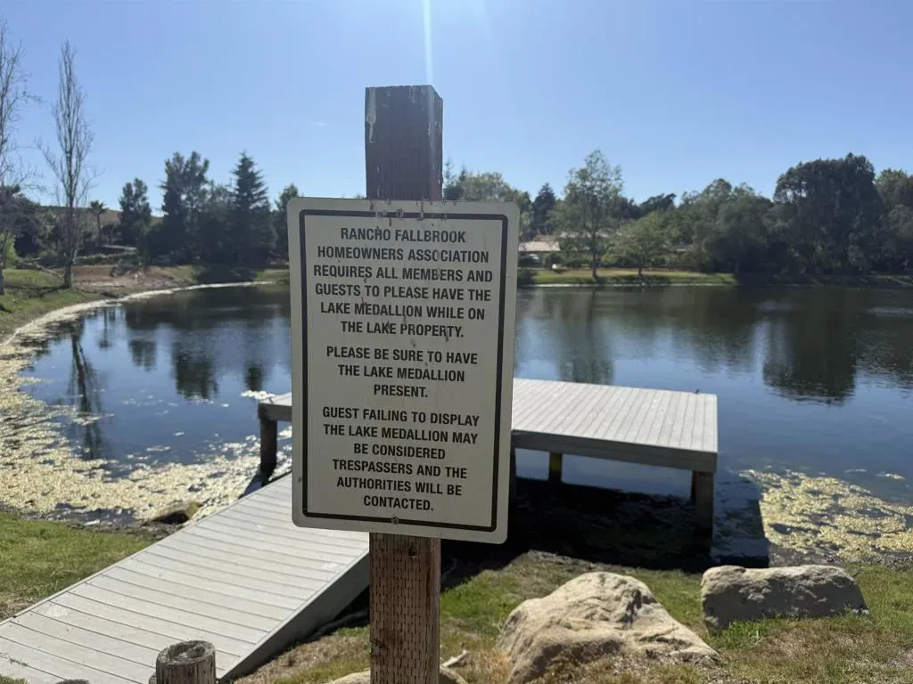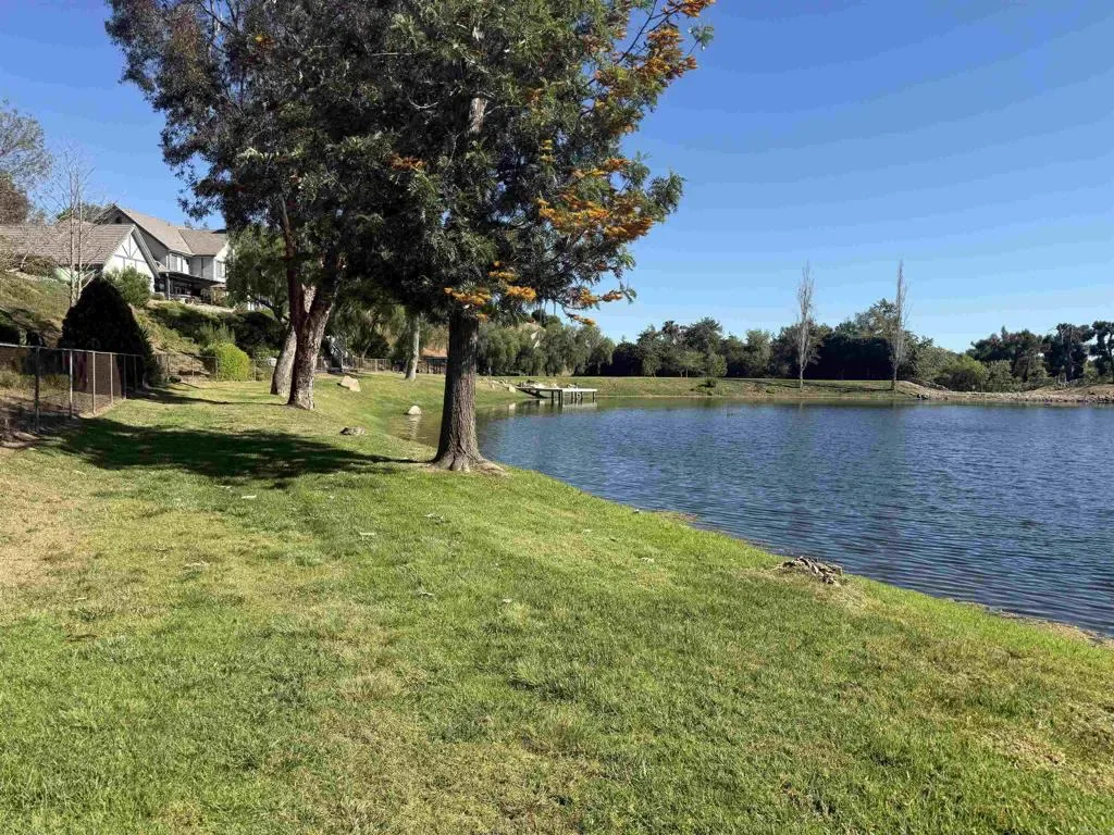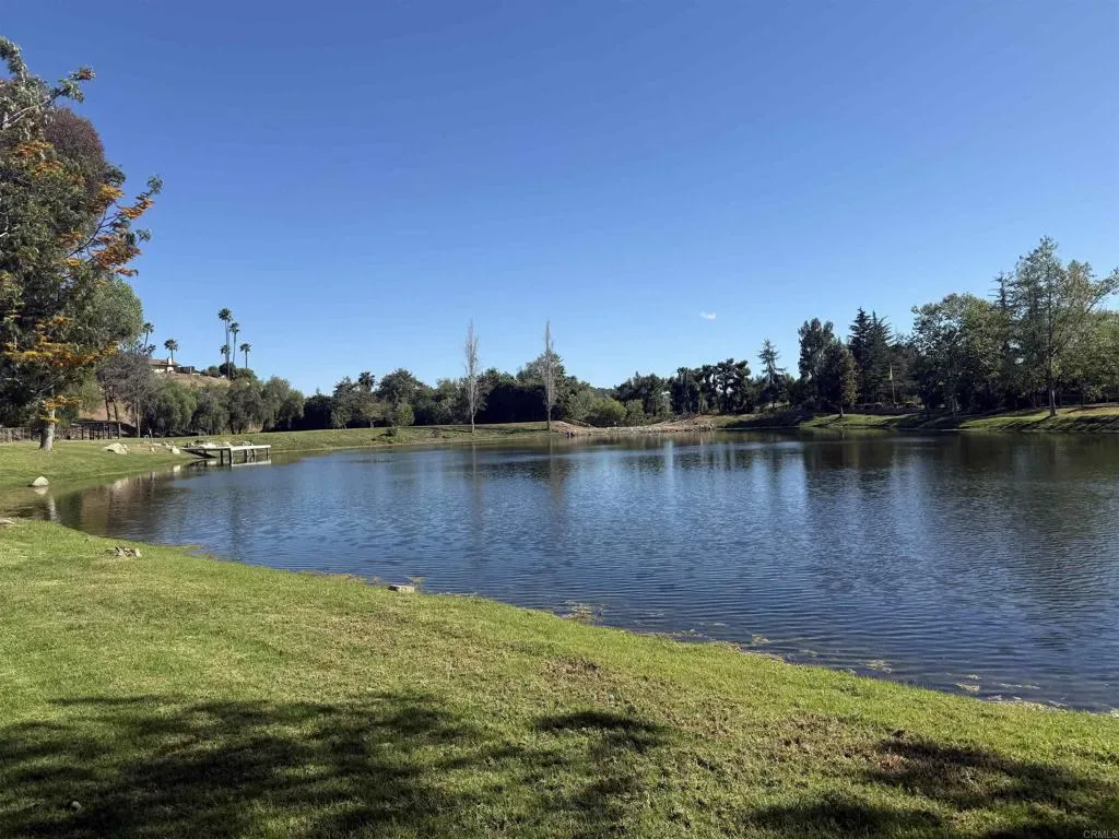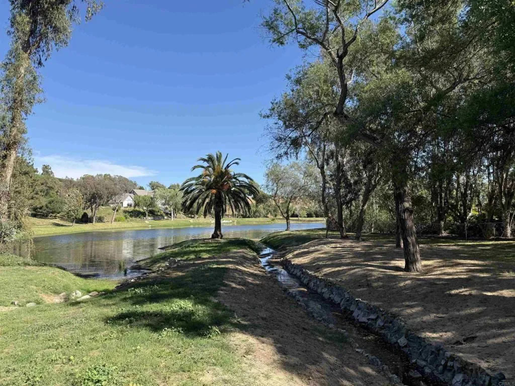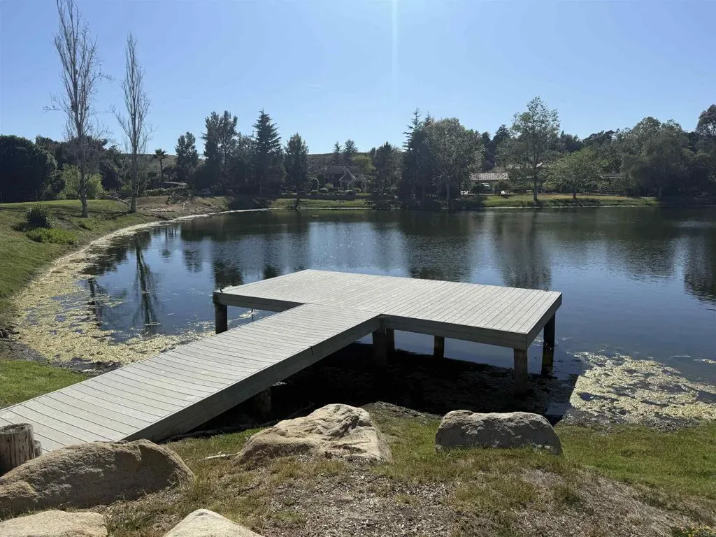 Located behind private gates in the prestigious Rancho Fallbrook community, this SINGLE-STORY, 3,872 sq. ft. custom estate on over two acres offers the perfect blend of privacy and modern luxury. The home features grand vaulted ceilings, a peaceful entry fountain, and a stately library/den. The highly desirable floor plan ensures ultimate comfort as every bedroom functions as a private retreat with its own en suite bathroom. Outside, the property transforms into a private resort with a solar-heated, pebble-tech pool and spa, two expansive covered patios, a fire pit, and a dedicated space for a custom outdoor kitchen. Complete with a fully owned solar system and a rare four-car garage, this move-in-ready home is designed for both high-end entertaining and quiet country living. The property is just a pleasant 10-minute walk from this beautiful community lake. The serene shoreline features calm waters, grassy banks, mature pine trees, and a small dock, with palm trees in the distance. It’s a peaceful community amenity perfect for walks, relaxation, and enjoying scenic sunset views.