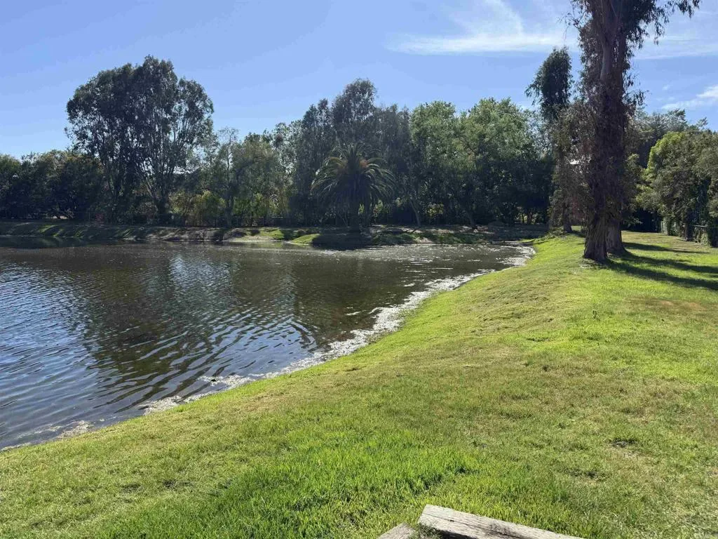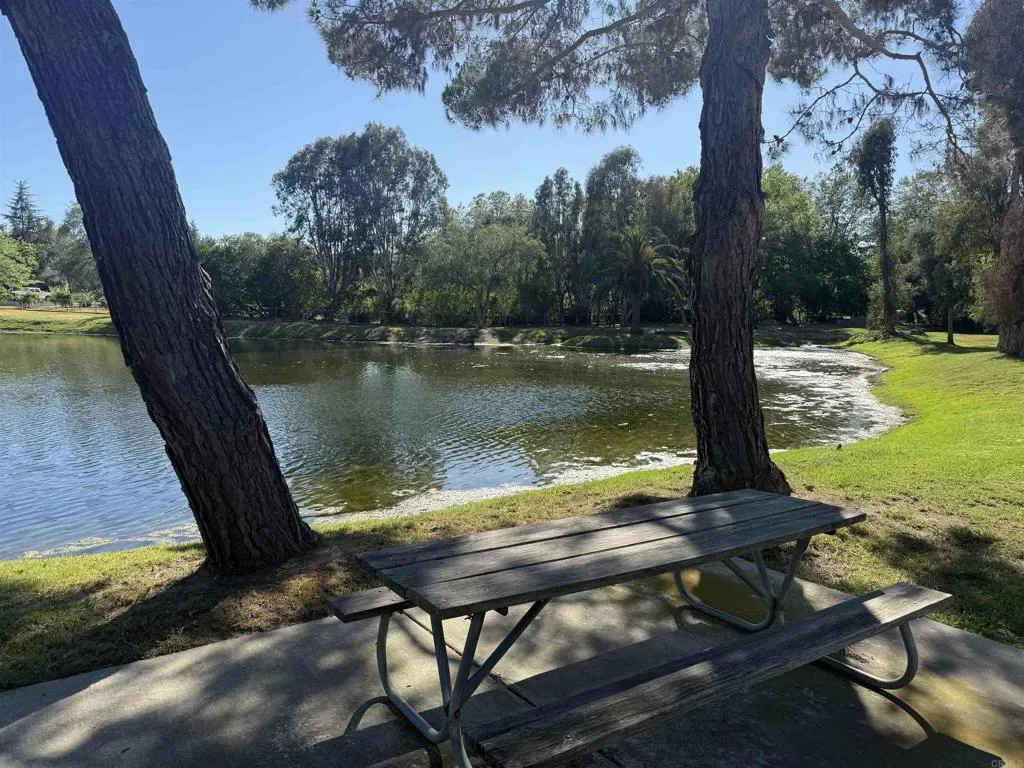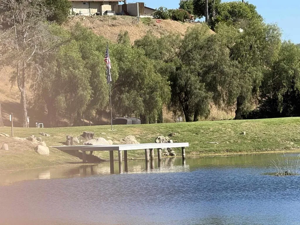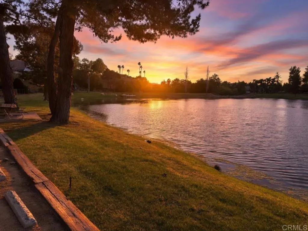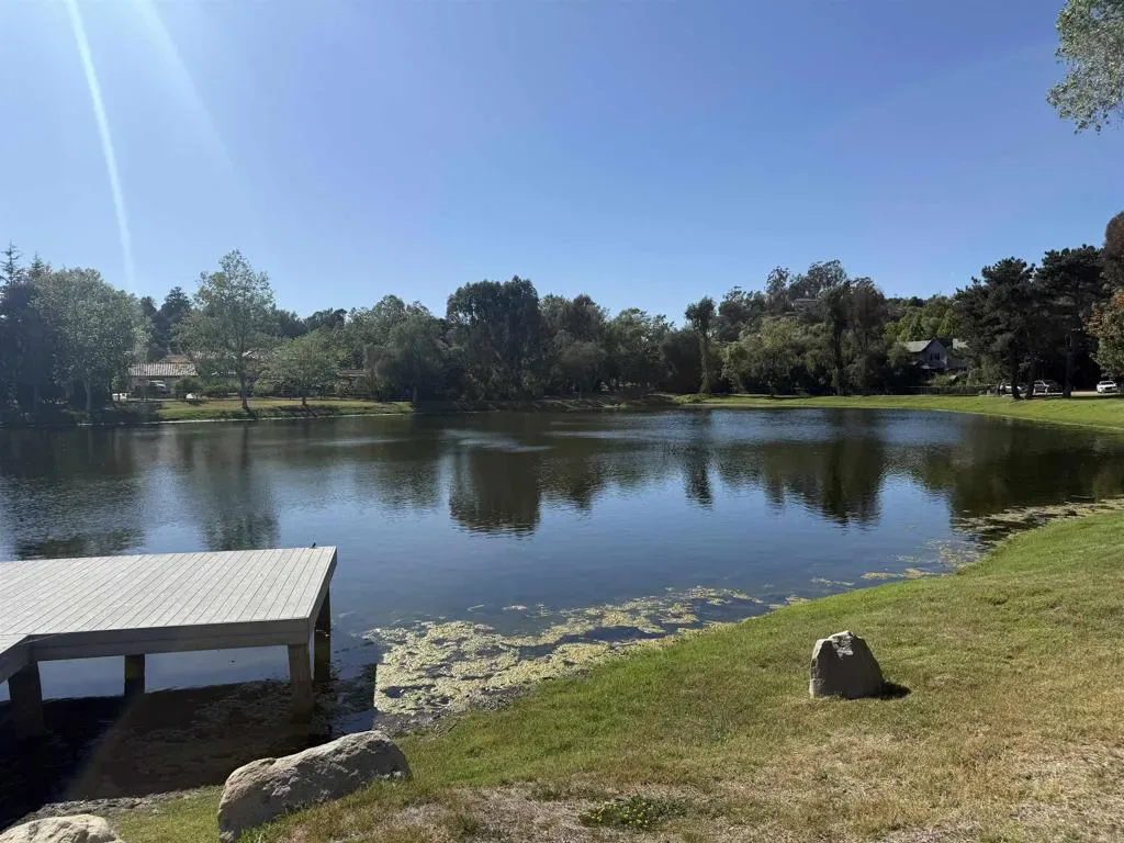 Located behind private gates in the prestigious Rancho Fallbrook community, this SINGLE-STORY, 3,872 sq. ft. custom estate on over two acres offers the perfect blend of privacy and modern luxury. The home features grand vaulted ceilings, a peaceful entry fountain, and a stately library/den. The highly desirable floor plan ensures ultimate comfort as every bedroom functions as a private retreat with its own en suite bathroom. Outside, the property transforms into a private resort with a solar-heated, pebble-tech pool and spa, two expansive covered patios, a fire pit, and a dedicated space for a custom outdoor kitchen. Complete with a fully owned solar system and a rare four-car garage, this move-in-ready home is designed for both high-end entertaining and quiet country living. The property is just a pleasant 10-minute walk from this beautiful community lake. The serene shoreline features calm waters, grassy banks, mature pine trees, and a small dock, with palm trees in the distance. It’s a peaceful community amenity perfect for walks, relaxation, and enjoying scenic sunset views.