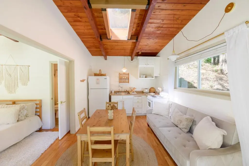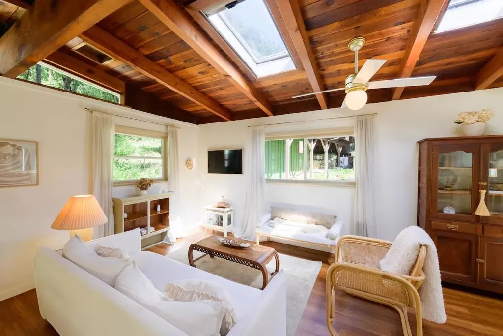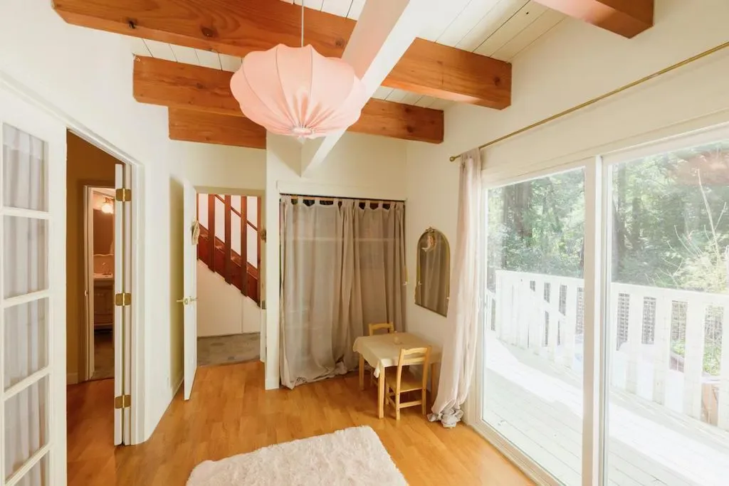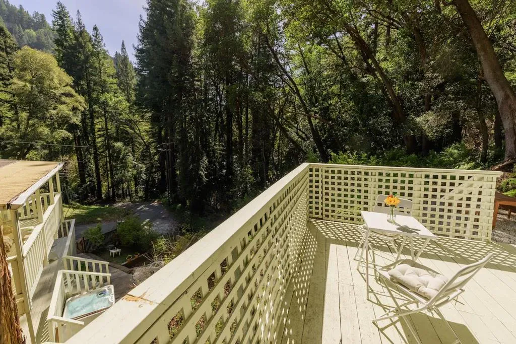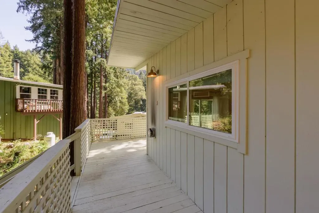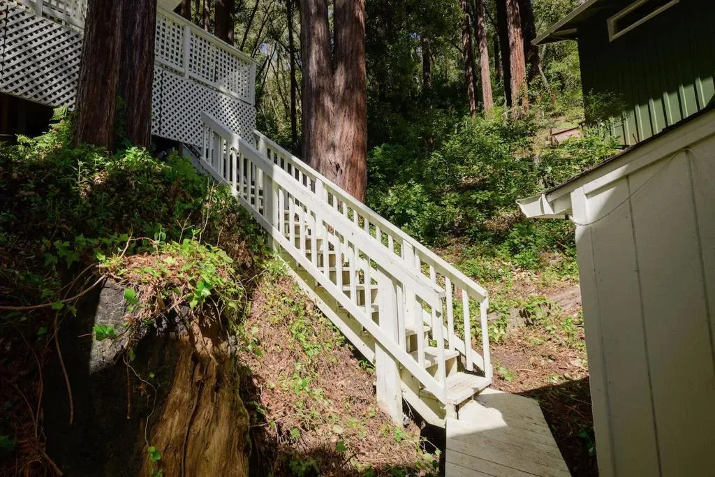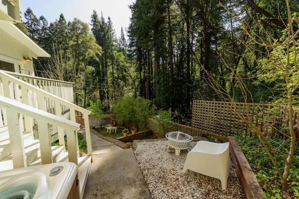 Beautifully updated home with separate ADU on a large lot featuring a peaceful forest setting and seasonal creek. The main home offers a desirable reverse floor plan with the great room and kitchen located upstairs, while three bedrooms and a full bath are on the lower level. The spacious primary bedroom is filled with natural light from multiple windows and skylights and features stunning vaulted wood-beam ceilings and private access to the front porch. The inviting kitchen offers beautiful wood-block countertops and abundant white cabinetry and flows seamlessly into the living and dining areas. Dramatic vaulted ceilings and expansive windows bring in natural light and showcase the surrounding nature. Step out onto the balcony deck for al fresco dining among the trees. A large storage and laundry room is conveniently located between the main house and ADU. The detached ADU offers a full kitchen, dining area, separate bedroom/living space, and full bathroom – perfect for guests, extended family, or a home office. Reverse osmosis water system. Multiple decks and patios, hot tub, outdoor shower, and sunny lawn areas create wonderful outdoor living spaces. Minutes to downtown Felton, hiking trails, and the beaches of Santa Cruz.