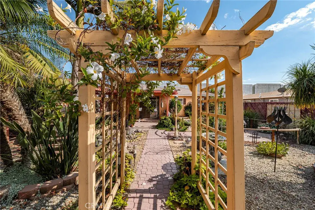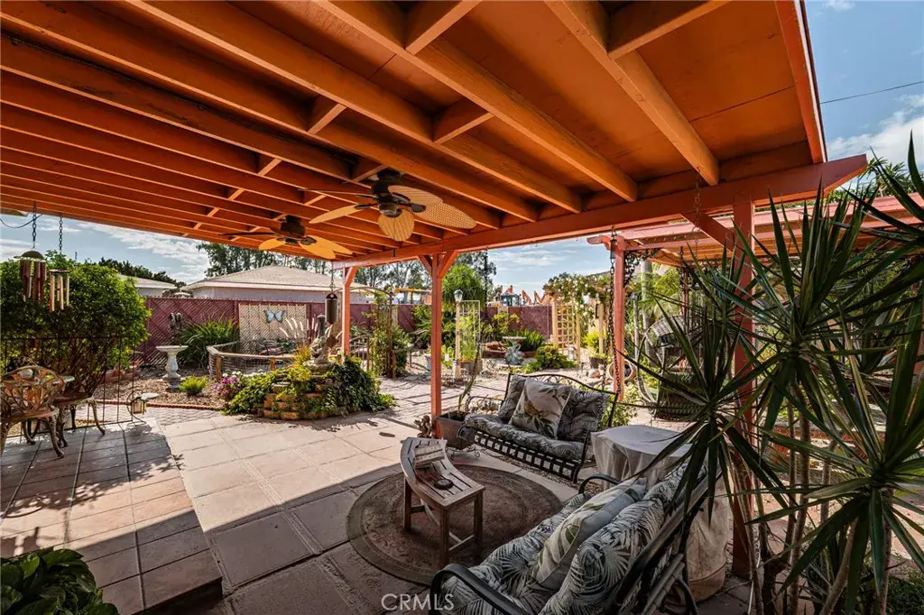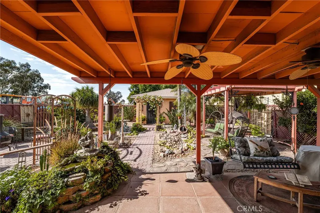 The backyard includes covered patio with ceiling fans, a well-maintained garden area, and the front yard is finished with drought-tolerant landscaping. Property is on septic.