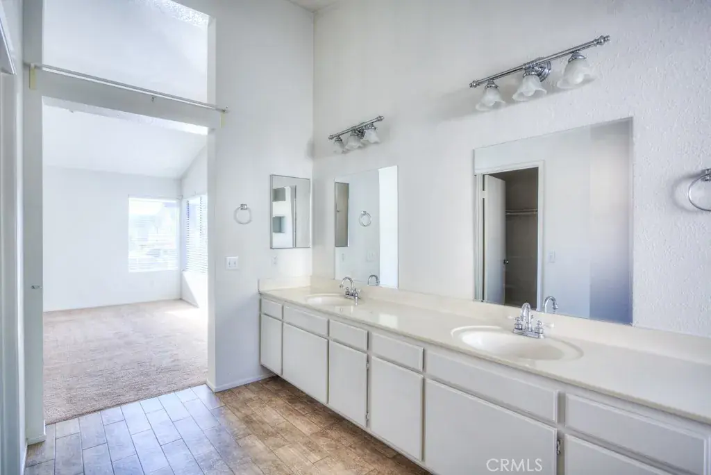 Upstairs, the home is fully carpeted with new carpet. The primary suite features high ceilings, abundant natural light, dual sinks, a separate tub and shower, and a large walk-in closet. The additional bedrooms are newly painted, include window blinds, and share a full bathroom.