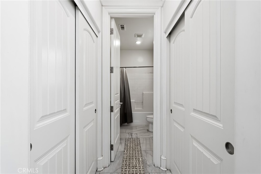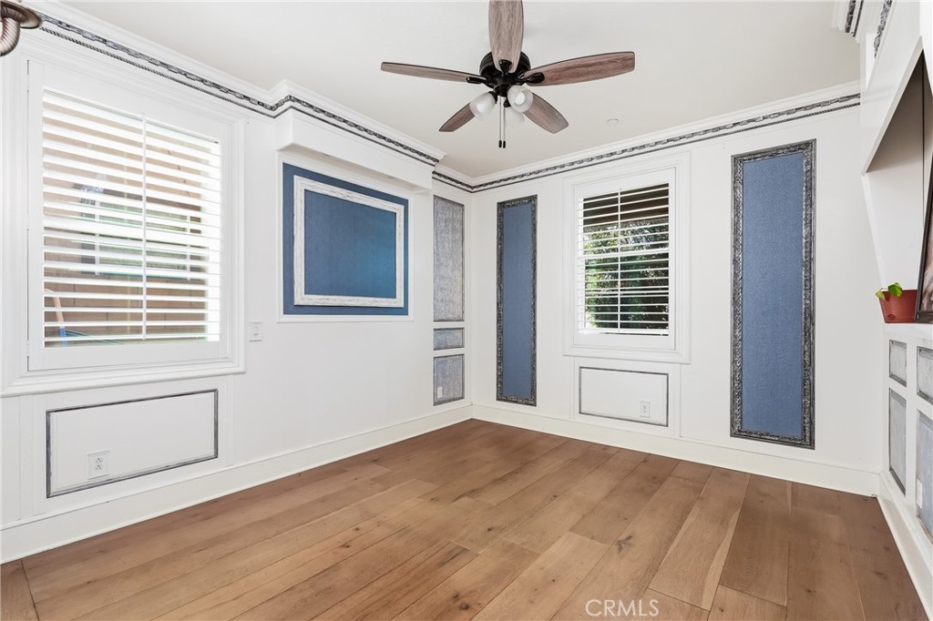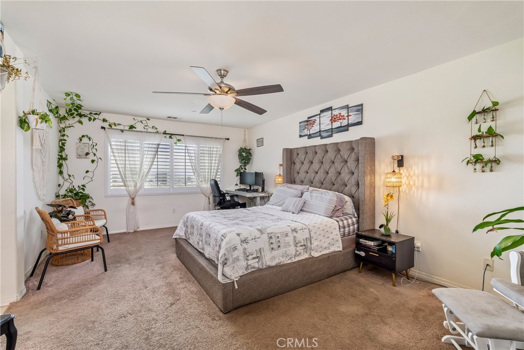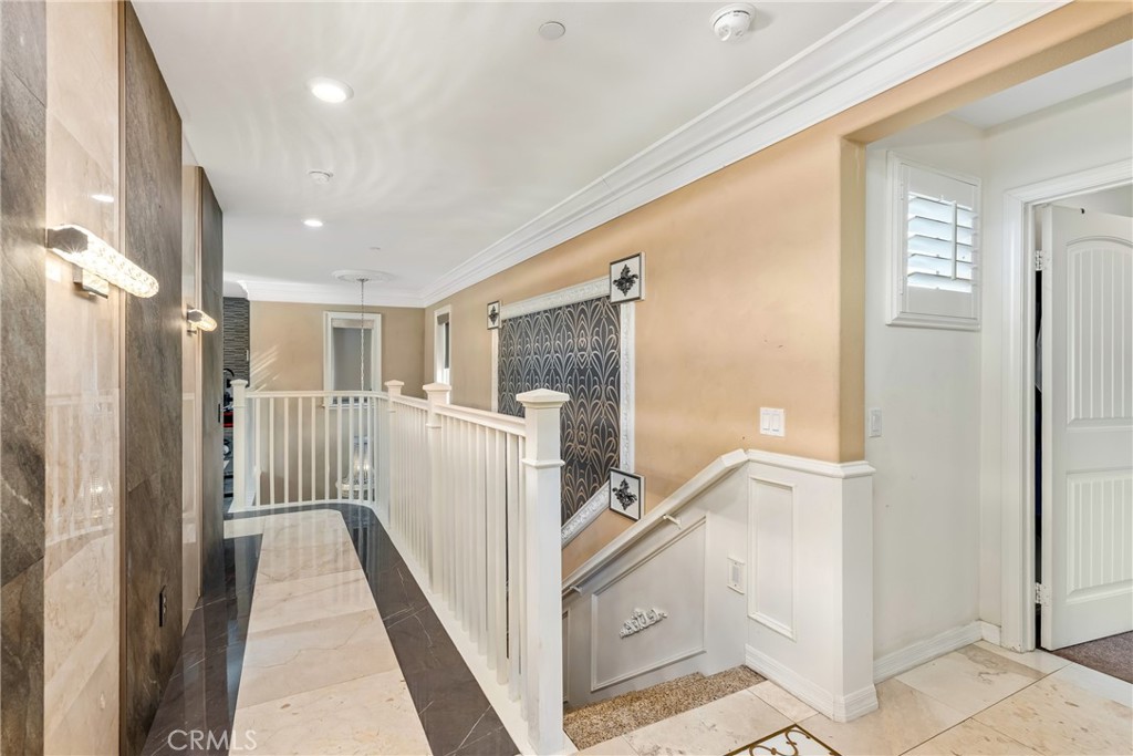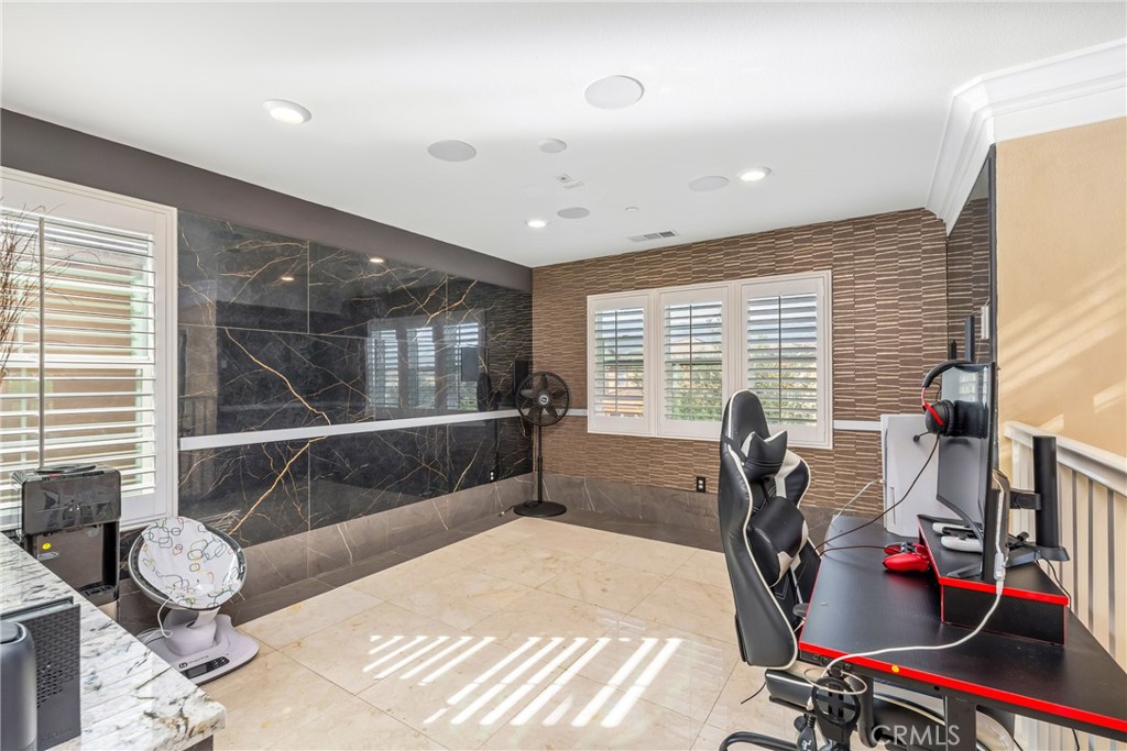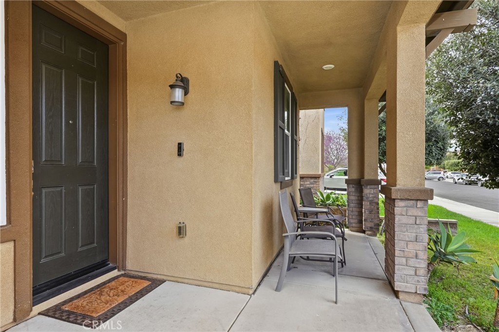 Welcome to this beautiful two-story home located on a quiet cul-de-sac in a sought-after Fontana community. Built in 2015 and situated in a clean, well-maintained neighborhood with great curb appeal. Downstairs features a grand entry with soaring ceiling and an open, light-filled floor plan where the kitchen, dining, and living areas flow seamlessly. Thoughtful custom finishes are showcased throughout the home, including crown molding, wainscoting, marble tilework, a granite staircase, and plantation shutters. The kitchen is beautifully appointed with custom cabinetry, granite countertops, a spacious 9-foot island with pendant lighting, a breakfast bar, double oven, and a large pantry. A downstairs bedroom with an en-suite bathroom offers 9-foot ceilings and wood flooring, ideal for guests or multi-generational living. A separate guest half bath with marble flooring adds convenience. Outside, the low-maintenance backyard features a covered patio, creating a perfect space for outdoor enjoyment. Upstairs features a versatile loft complete with a built-in media center and speaker system, ideal for relaxing or entertaining. The spacious primary suite offers a well-appointed ensuite bathroom with a soaking tub, walk-in shower, dual sinks with a dedicated makeup area, and a generous walk-in closet. Two additional bedrooms are also located upstairs, along with a guest bathroom featuring dual sinks and a shower/tub combination. Elegant marble tile flooring enhances the upstairs common areas, while the bedrooms are finished with comfortable carpeting. A conveniently located upstairs laundry room includes additional storage space. The community provides access to top rated schools, shopping, and convenient freeway access. A low HOW provides resort-style amenities including a swimming pool, park, clubhouse, BBQ, and picnic areas. The home also includes a solar system that will transfer to the buyer. Combining refined finishes with modern convenience and exceptional community amenities, this home offers the perfect balance of luxury and everyday living.