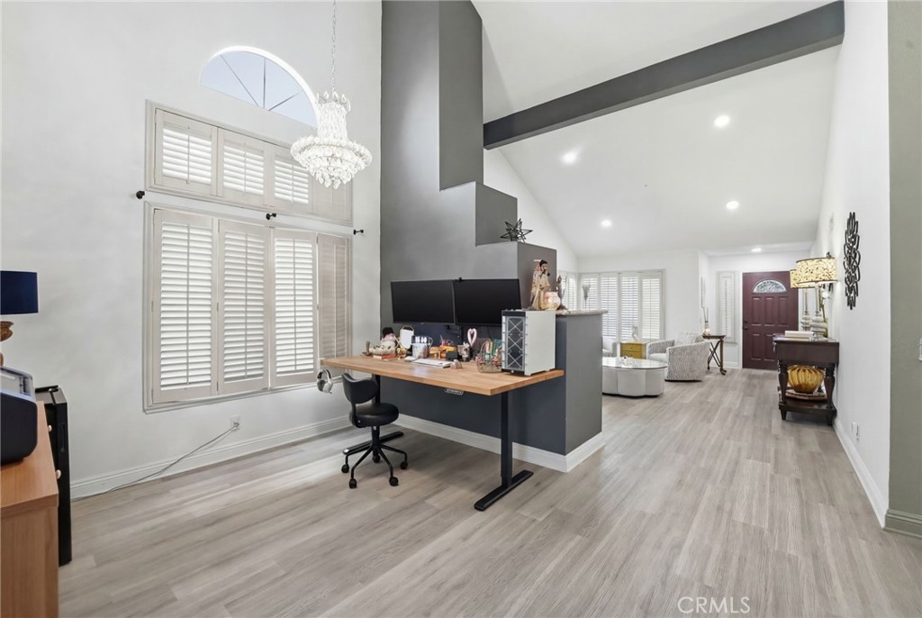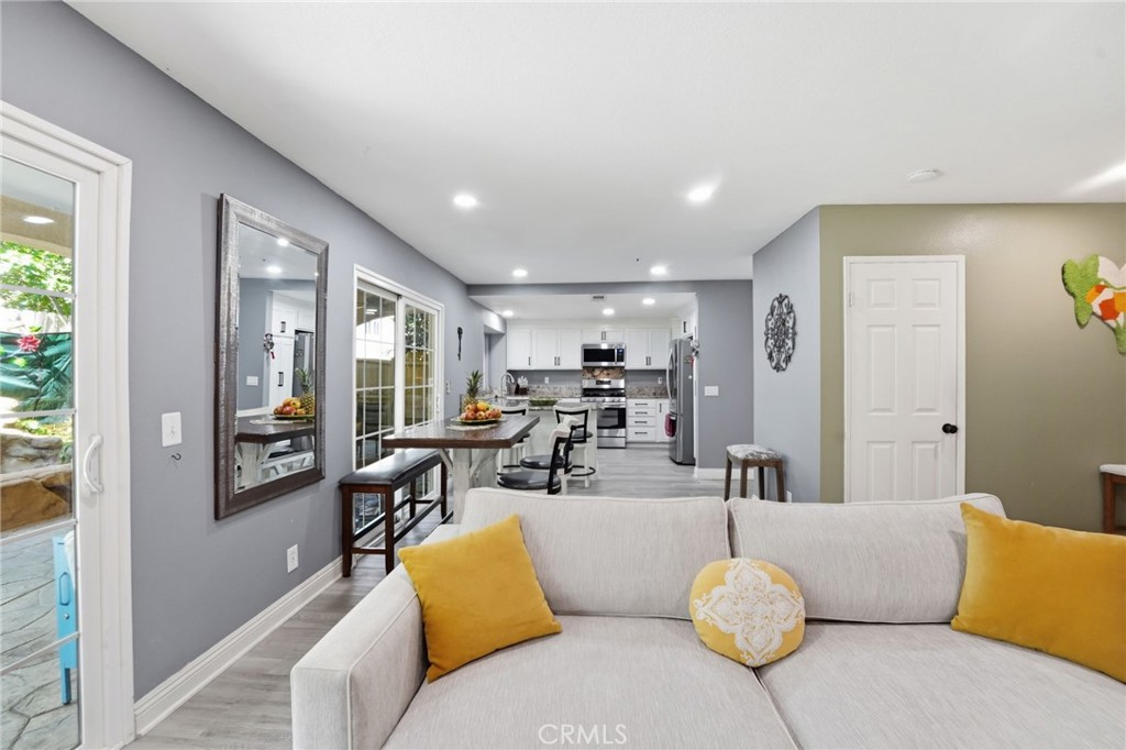 Step inside to soaring vaulted ceilings in the formal living and dining areas, creating an open and inviting first impression. The main level features durable laminate plank flooring throughout and flows seamlessly into the kitchen and family room, ideal for everyday living and entertaining. The kitchen is equipped with granite countertops, stainless steel appliances, and ample cabinet space, all overlooking the backyard with a large covered patio, perfect for outdoor gatherings. You will also find a lemon tree adding a touch of charm to the backyard space.
