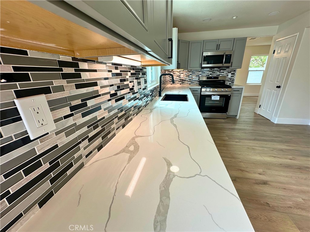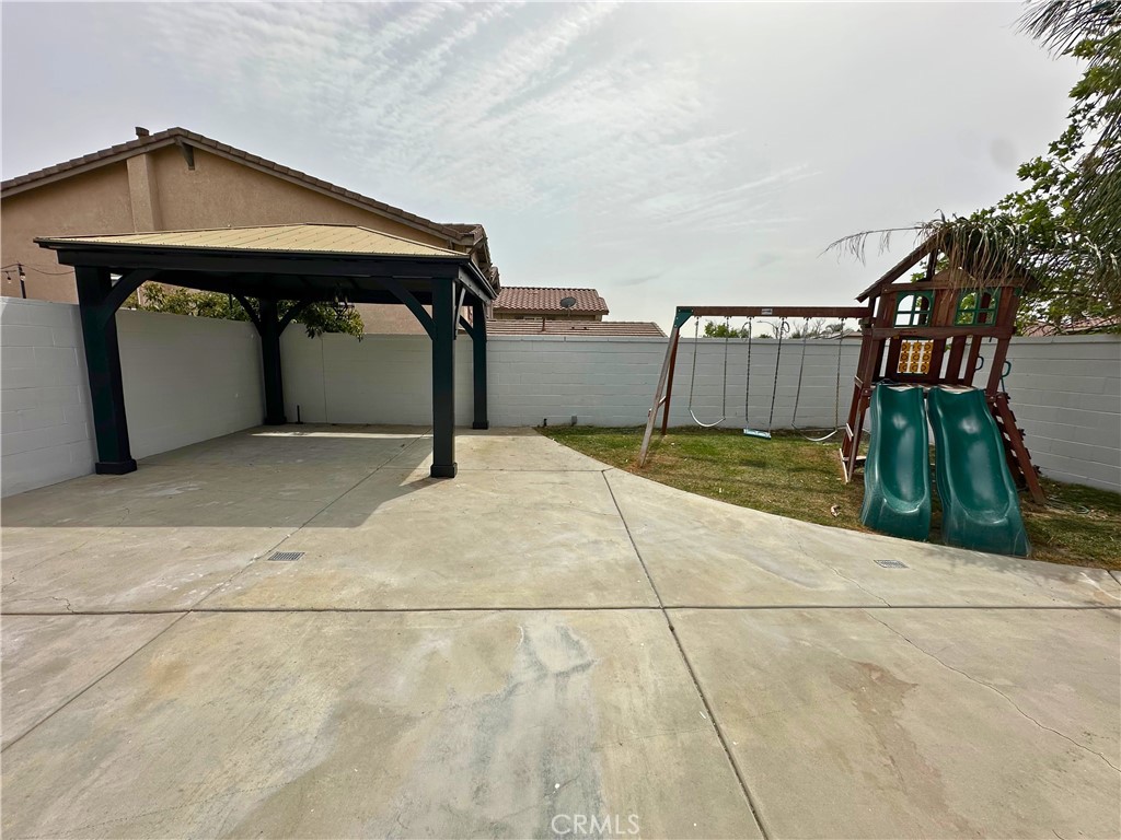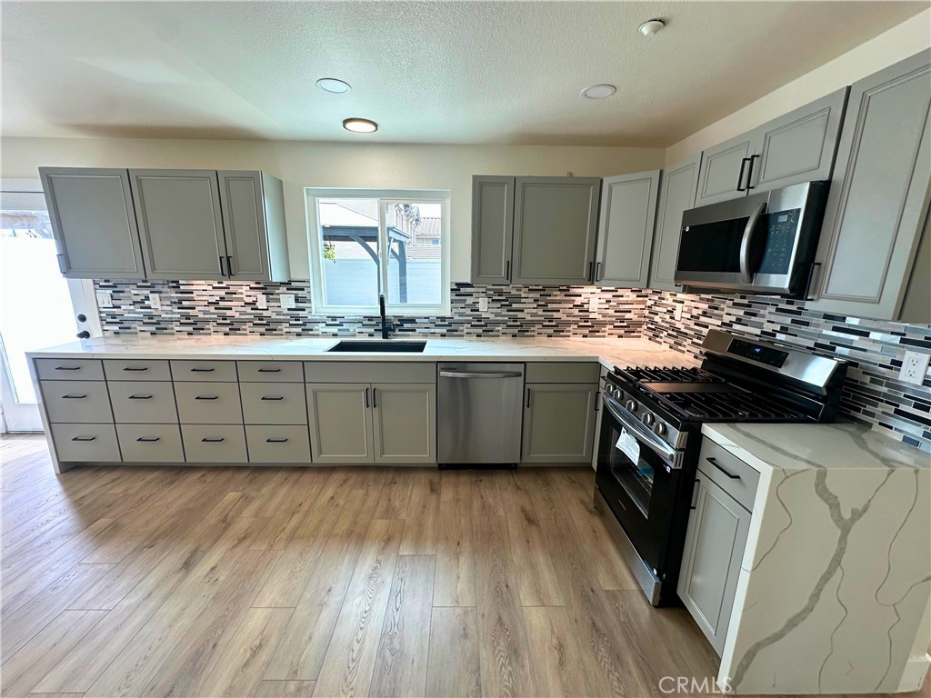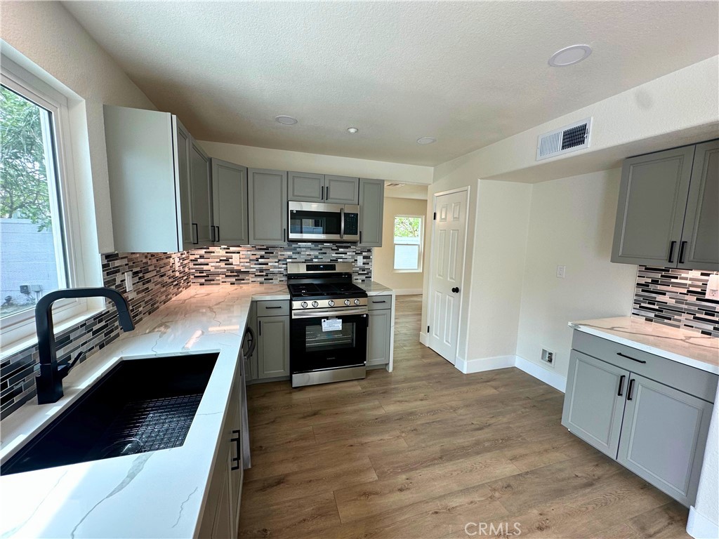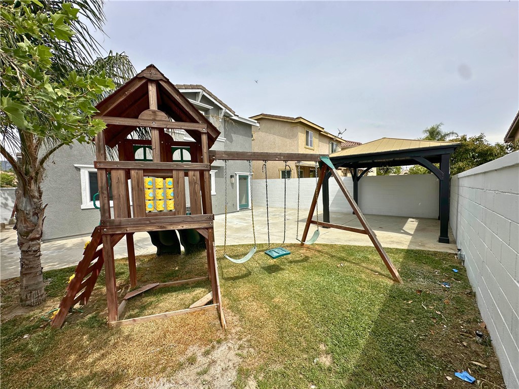 Beautifully updated home located in the Sierra Lakes Golf Community with NO HOA!! Spacious corner lot two-story house has 5 bedrooms and 2.5 bathrooms, open floor plan with new interior and exterior paint, laminate wood flooring throughout, and all new windows with lots of natural light. The main level includes a convenient downstairs bedroom, an updated half bathroom along with a laundry room. Has a separate dining area, remodeled kitchen featuring updated cabinetry, quartz countertops, a stylish backsplash, and under-cabinet lighting, has recessed lighting throughout the home. Upstairs has 4 bedrooms and 2 updated bathrooms, Master bathroom with a walk in closet, central air conditioner and heating. Attached 2-car garage, and a spacious backyard with a gazebo and kids playset—great for entertaining or relaxing outdoors. Centrally located within walking distance to major shopping centers, restaurants, Chase bank, and Lowes hardware store, just minutes from the 210 freeway, Costco and nearby schools. A must see!!