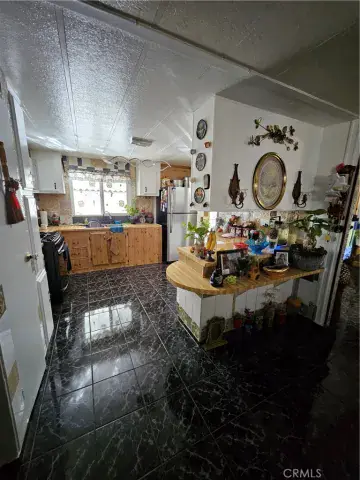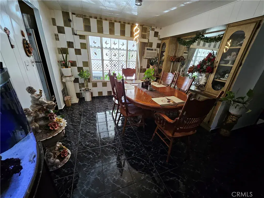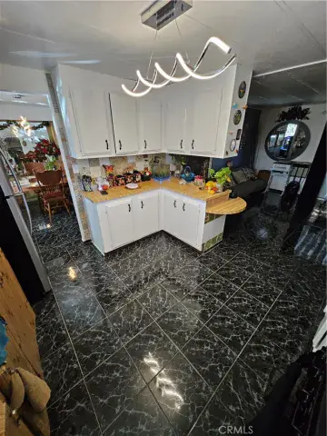 Welcome to this charming and well-cared-for 3 bedroom, 2 bathroom manufactured home, offering a warm and inviting atmosphere with plenty of living space. Step into a bright, open dining area with large windows, custom tile accents, and a modern light fixture that adds a stylish contemporary feel. The kitchen features generous counter space, butcher-block style countertops, white cabinetry, tile backsplash, gas stove, stainless steel refrigerator, and a convenient peninsula—perfect for prepping meals, A comfortable living room with plenty of room to entertain.