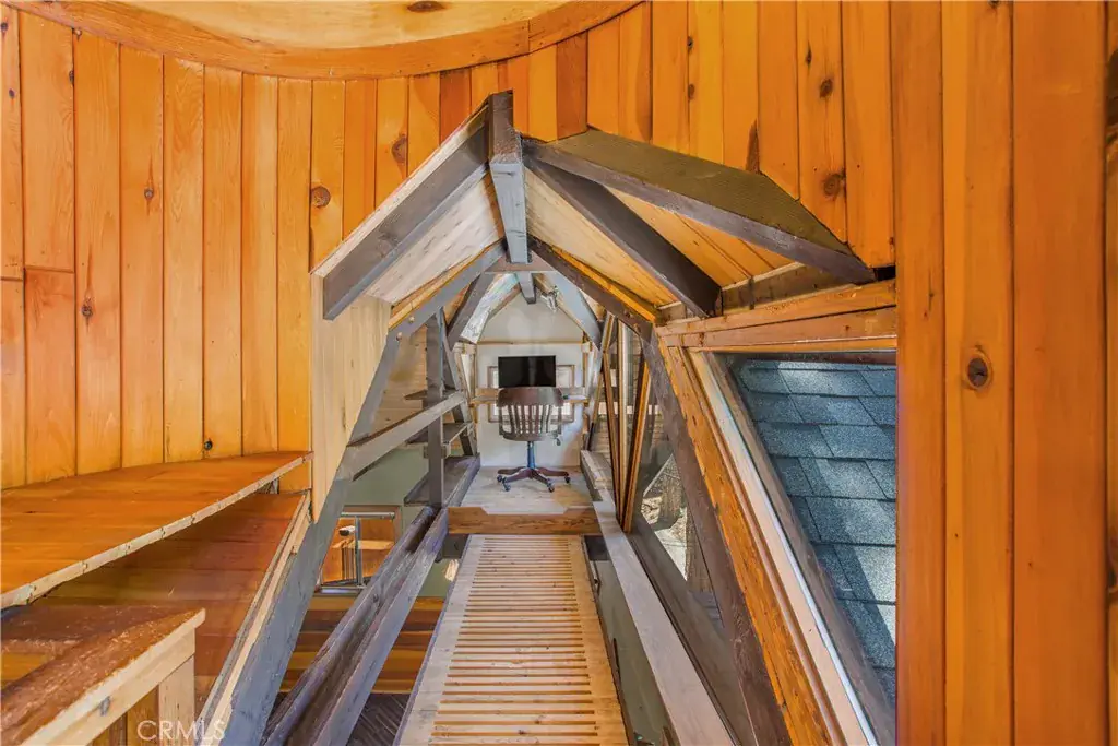 Continue up the spiral staircase to an additional catwalk and bonus office or storage space.