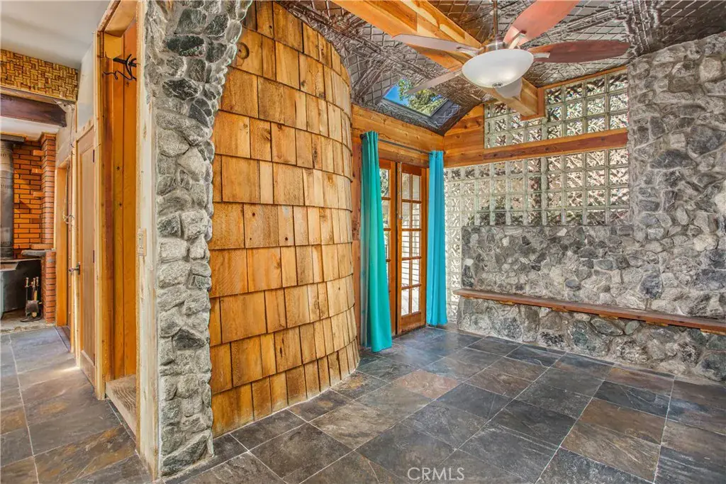 The stunning primary bathroom creates a spa-like experience with a relaxing steam shower. Just off the kitchen, the versatile stone dining room or office showcases a charming stone arch, skylight, and double doors that open to the deck, blending indoor and outdoor living.