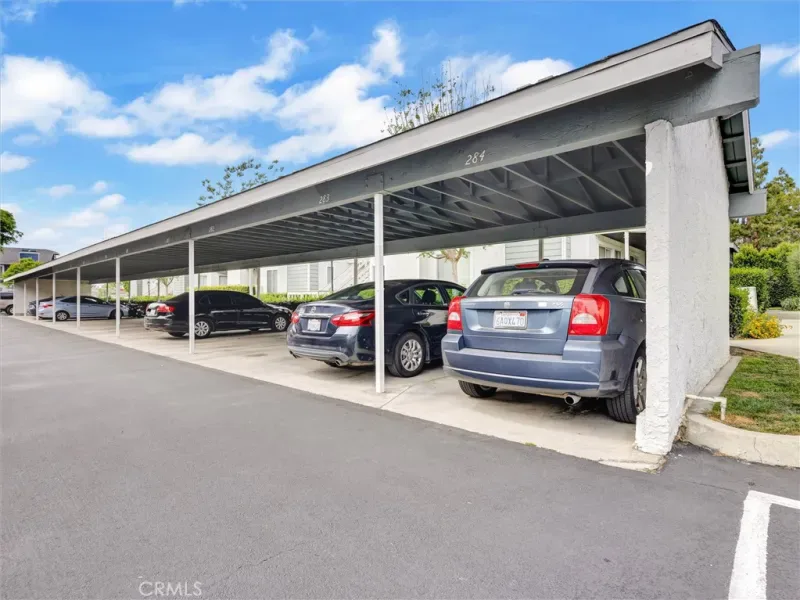 You are invited to make your home at this private and quiet New Chase condominium, in a premium location, priced to give you the savings to make it a trophy! This building side offers the most private and quiet situation, facing greenery and a community greenbelt, with no drive-by traffic. The vaulted ceilings of this 2 bedroom 1.25 gem make it feel and appear larger than it’s size. The large primary bedroom offers a separate vanity and sink, a huge walk-in closet, and a sliding door exit to the private balcony patio. A second bedroom has its own large closet with sliding door, and easy access to the bathroom and laundry closet. A stackable washer/dryer unit is included! The balcony is also accessible from a slider in the dining area, and a large exterior storage closet is great for your season decorations, or other items. Everyone loves the New Chase grounds, where residents have an assigned covered carport space (#284) and permits for additional vehicles. Parking is a breeze inside this gated community, and a convenient online temporary permit portal is available for overnight guests. The dues at $515/month are incredibly low, as they include hot and cold water, trash, a sparkling pool and two spas—recently remodeled. The lovely grounds are extremely well-kept, and the community is very amenable to pet ownership. Your FHA/VA is welcome, as the responsibly managed association is approved for government financing programs. Nearby within walking distance are the amazing Mile Square Park, Centennial Park, scenic trails, shopping centers, fine dining, and top rated schools. You will be a short drive to the 405 & 22 freeways. Costco, and South Coast Plaza-and a wonderful 7 mile bike ride to the beach. Don’t miss it!