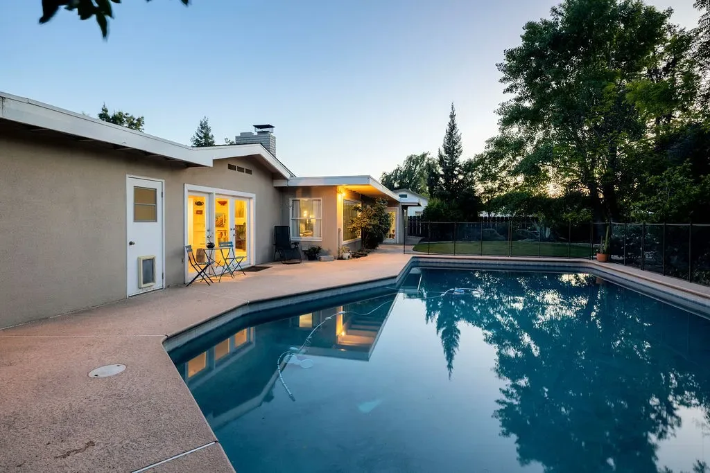 Step inside to a grand living space bathed in natural light, featuring oversized picture windows, a natural gas fireplace, and serene views in every direction. Designed to be the heart of the home, the spacious kitchen offers a breakfast bar, modern appliances, open shelving, a walk-in pantry, and original Old Fresno” tile. From here, you’ll enjoy a bird’s-eye view of both living areas and the sparkling pool beyond. The dining room provides a warm and inviting setting to gather and unwind, complete with a wood-burning fireplace and built-in shelving.Retreat to the expansive primary suite, where a spa-like ambiance awaits. This private sanctuary features a beautifully updated bath, multiple closets, French doors leading to the backyard, and its own split-unit heating and cooling system for personalized comfort. Additional generously sized bedrooms offer ample closet space and picturesque views of the outdoor landscape.