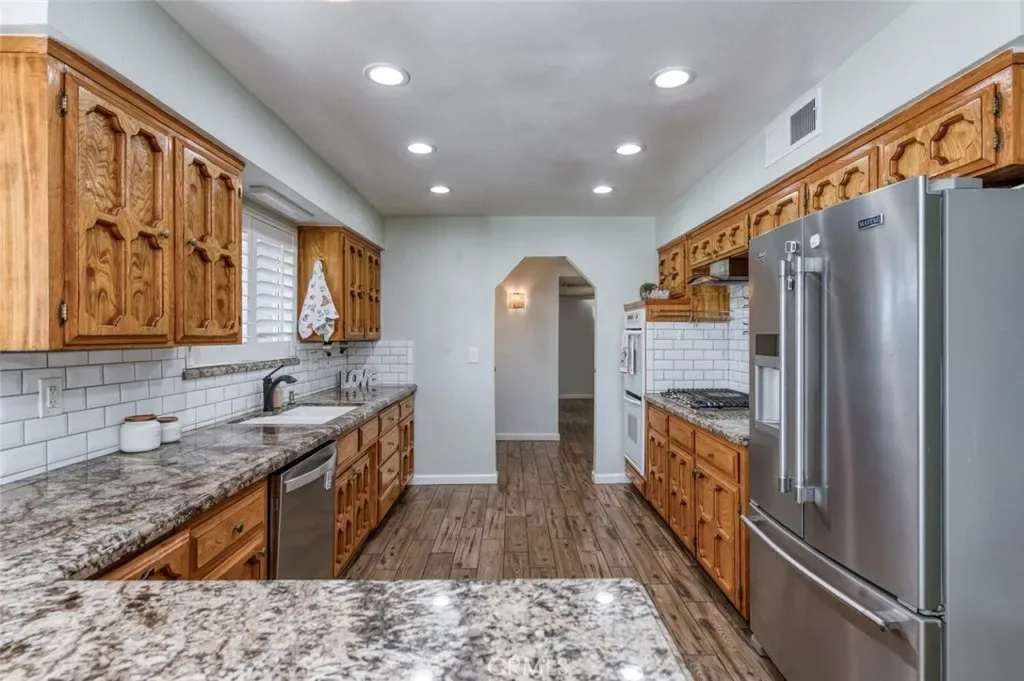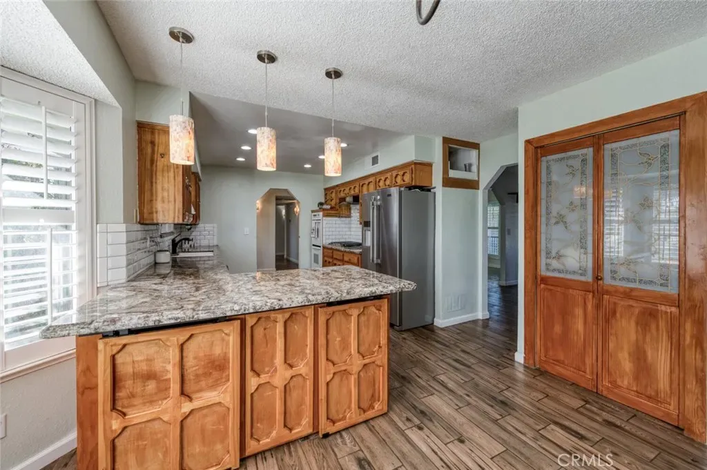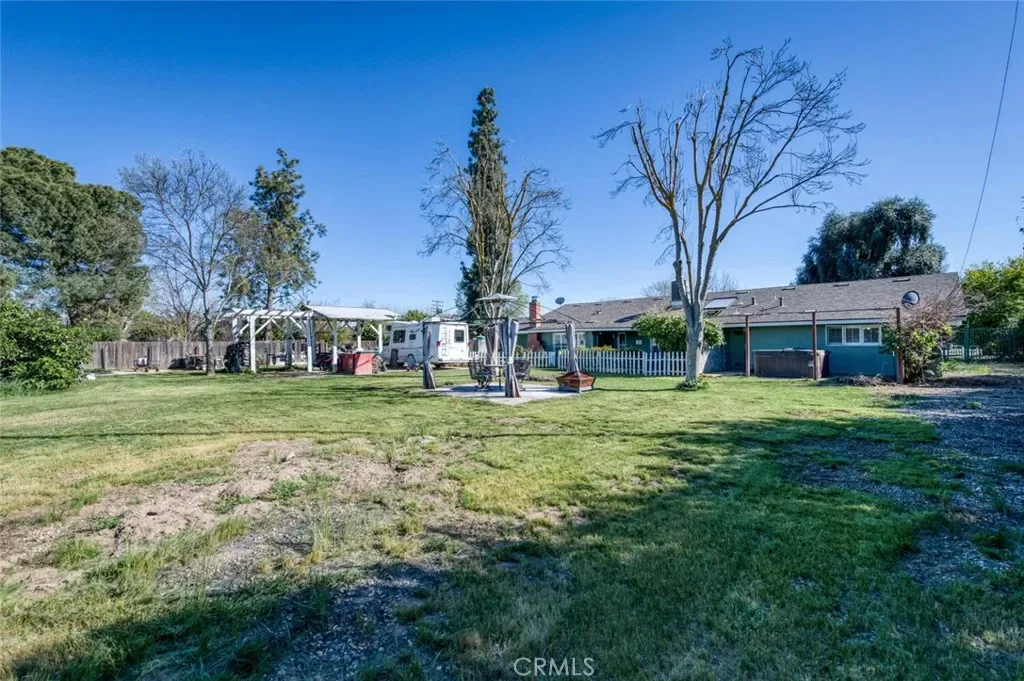 blending comfortable living with country charm. The kitchen features granite countertops, subway tile backsplash, a gas cooktop, double ovens, pantry, and an adjacent dining area. A formal living and dining room provides flexible space for a home office, library, or additional gathering area. The spacious family room includes a wood-burning fireplace insert and sliding door to the backyard, offering flexibility for a fourth bedroom, office, or bonus room. Ceramic tile flooring, ceiling fans, and plantation shutters are featured throughout the home. The backyard offers a covered patio, open grassy area with mature landscaping, front and backyard sprinkler systems, and 30+ Satsuma Mandarin trees, creating a peaceful outdoor setting with room to relax or entertain. The property also features gated RV access, ample RV parking, and full RV hookup with power and a dedicated septic connection, providing additional functionality for recreational vehicles or equipment. A rare opportunity to own a charming country ranch on acreage within the Clovis Unified School District, offering space, privacy, and flexibility while remaining conveniently located to nearby amenities.