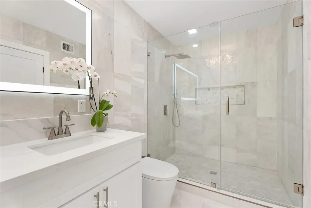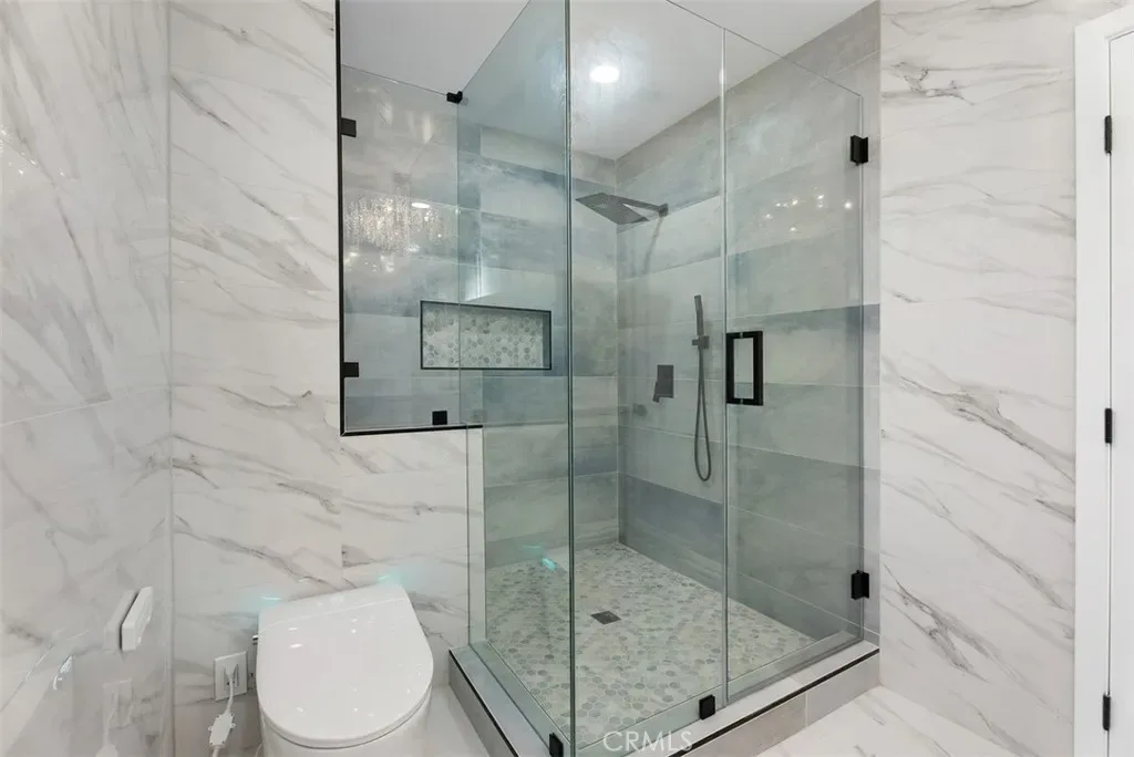 Each bathroom has been fully reimagined with custom finishes and full glass shower enclosures, delivering a spa-like experience with a cohesive, elevated aesthetic. The primary and secondary baths showcase designer tile, modern fixtures, and refined detailing throughout.