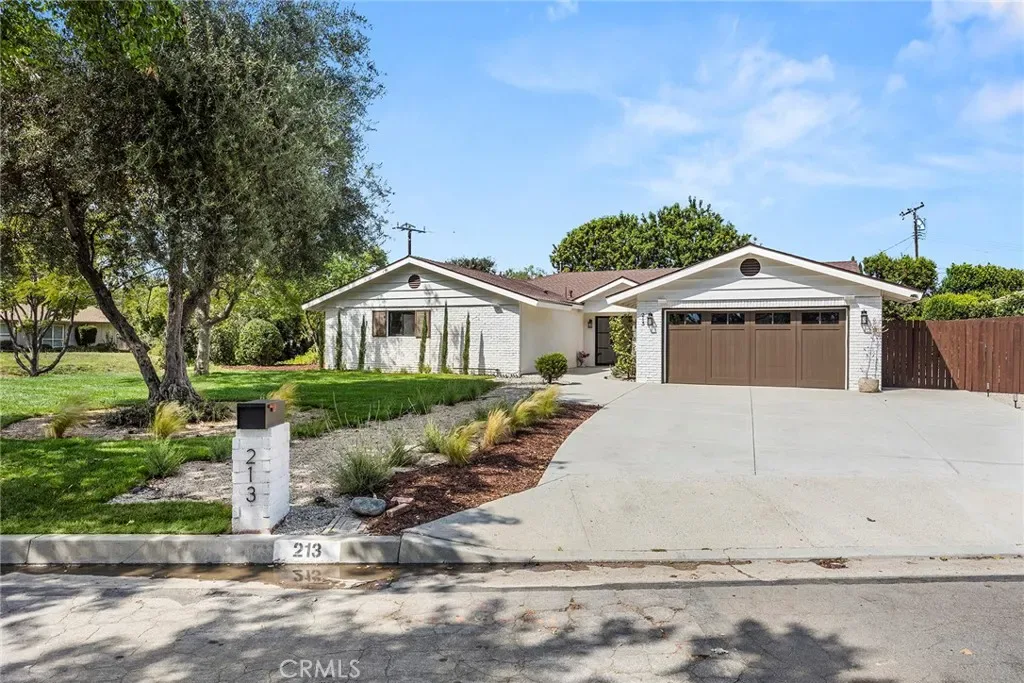 Situated on a desirable corner lot, the home features newly refreshed landscaping, a gravel and cement driveway, a solid oak custom garage door, and a garage upgraded with epoxy floors and finished drywall. Mature landscaping, including a 100+ year-old olive tree, lavender, and curated greenery, enhances both privacy and curb appeal while evoking a South of France sensibility.