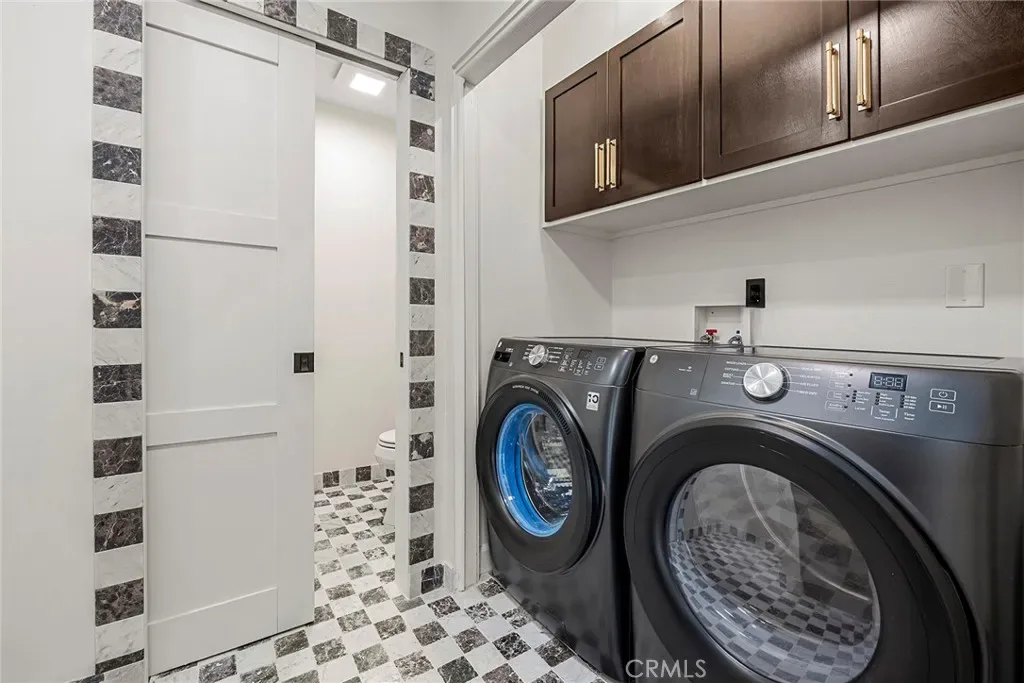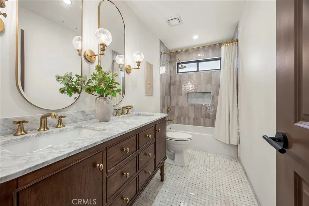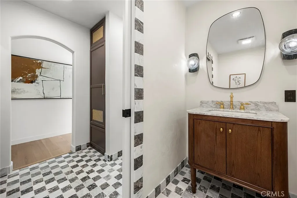 The primary suite offers a custom bathroom with hand-selected Zellige tile from Morocco, layered textures, and a walk-in closet designed for both style and organization. Additional highlights include a new roof with GAF Timberline HDZ shingles, marble checkerboard flooring in the laundry and powder bath, and matching outdoor patio tile that reinforces a cohesive indoor-outdoor design language.