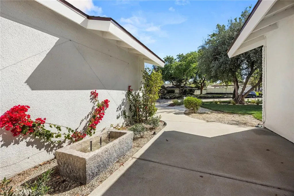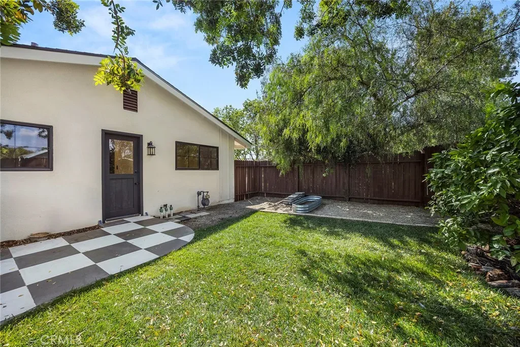 The backyard has been thoughtfully transformed into a private retreat, anchored by an authentic limestone fountain and complemented by a vegetable garden and open-air space ideal for dining, entertaining, or quiet relaxation under the surrounding greenery.