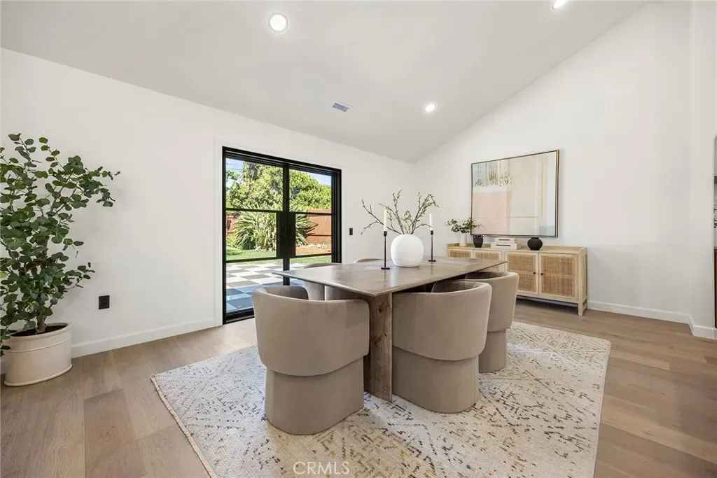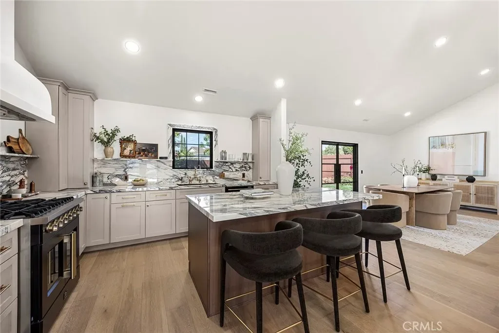 The kitchen features custom European marble countertops, a walk-in pantry, European-style appliances, and a custom 4 x 8 walnut island, creating an elevated and highly functional gathering space. It flows seamlessly into a vaulted living area with a custom fireplace and built-in cabinetry, ideal for both everyday living and effortless entertaining. Engineered white oak flooring, French-style windows, steel entry and rear doors, and a Dutch door opening to the backyard enhance both form and function while allowing natural light to move beautifully throughout the home. Upgrades include all-new plumbing with a completed main drain.