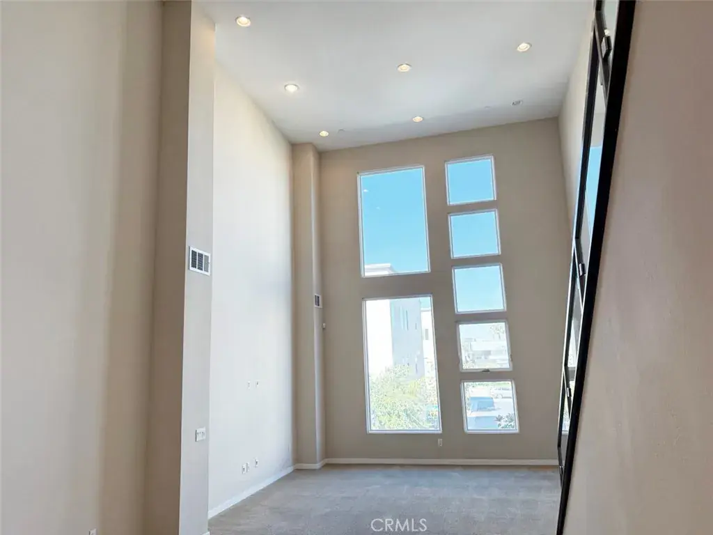 The main level features a spacious open-concept living and dining area with high ceilings and large windows that fill the home with natural light. The kitchen offers modern appliances, sleek countertops, and storage.