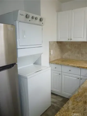 There are ceiling fans, recessed lights, dual pane vinyl windows, vinyl plank flooring and the following kitchen appliances included: gas range, washer/dryer stack, refrigerator and microwave oven/hood. In addition, there is an assigned one-car shared garage and one assigned uncovered space for a total of two off-street parking spaces that are all included in the rent. This is a no smoking and no pet building.
