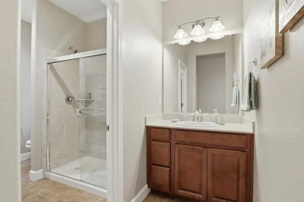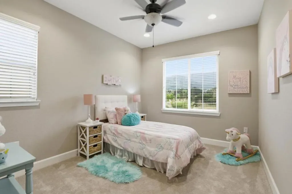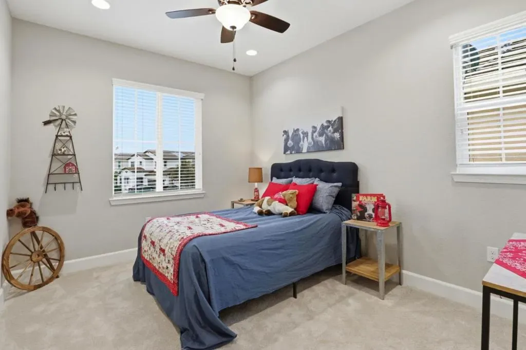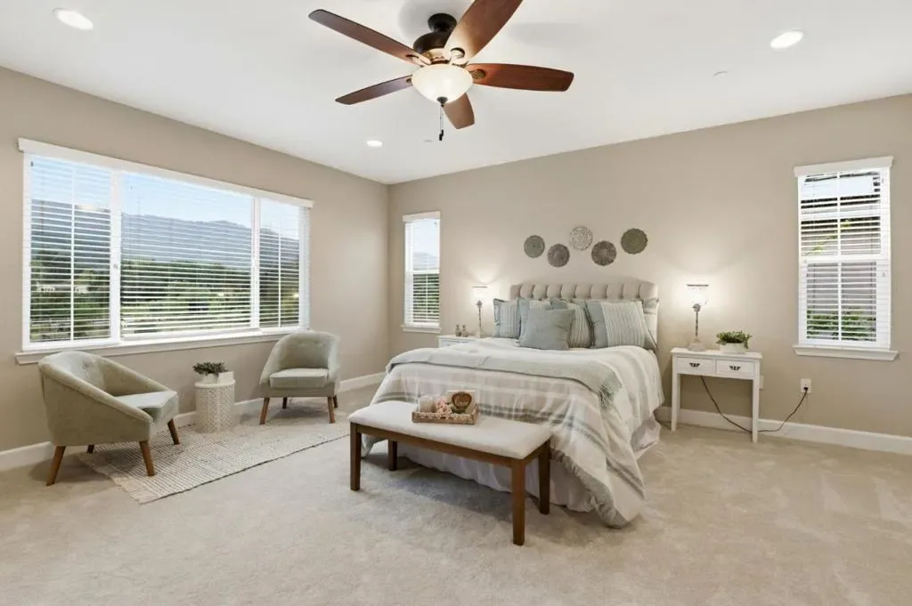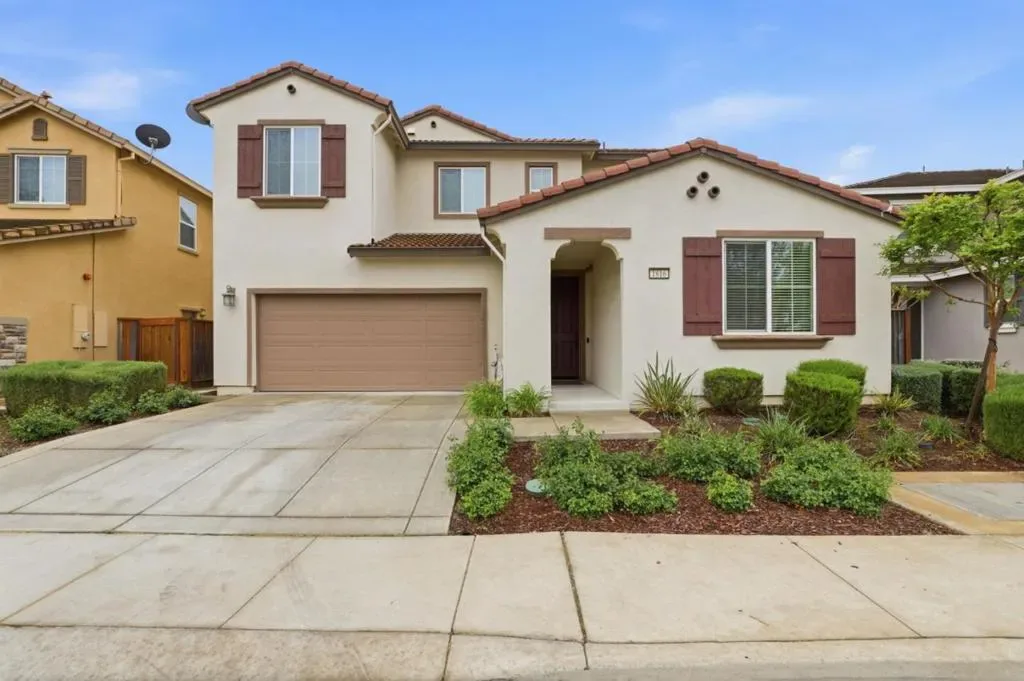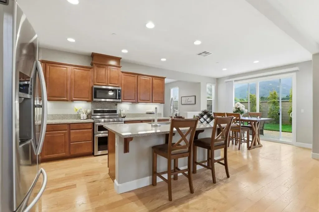Welcome to this stunning home in the prestigious Heartland. This luxurious home offers red oak hardwood flooring on the main level and a first floor bedroom with en suite bathroom. The kitchen is adorned with sunset gold granite countertops and cognac-stained cabinets, a center island with seating, a large walk in pantry, separate dining area, and upgraded stainless steel appliances including a dual oven range A separate formal dining room with upgraded glass French doors can also be used as a den. Boasting five bedrooms and four and a half bathrooms, the upstairs layout includes a grand primary suite with large walk-in closet and bathroom with Venetian marble in Milano beige, dual sinks, glass enclosed shower and Jacuzzi soaking tub, three additional bedrooms and two bathrooms, new carpeting throughout and a bonus loft area perfect for a family room, office or game area. Other amenities include a three bay tandem garage with level 2 Tesla Universal Charger, dual zone central heating and air, ceiling fans, and owned solar. The exterior features a landscaped backyard with concrete patio and gas line for outdoor BBQ. This gorgeous home sits on a premium lot with breathtaking views of the Santa Cruz Mountains and is located across from Uvas Creek Levee Trail and Hecker Pass park.