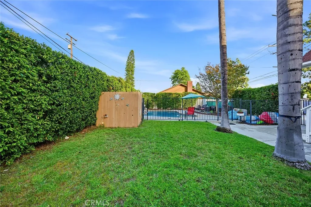 The backyard has both generously sized lawn and patio areas, in addition to the inviting, fenced swimming pool for summer fun and relaxation.