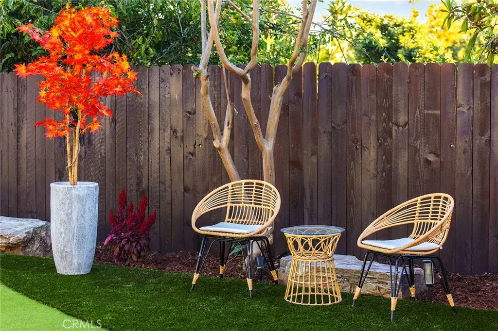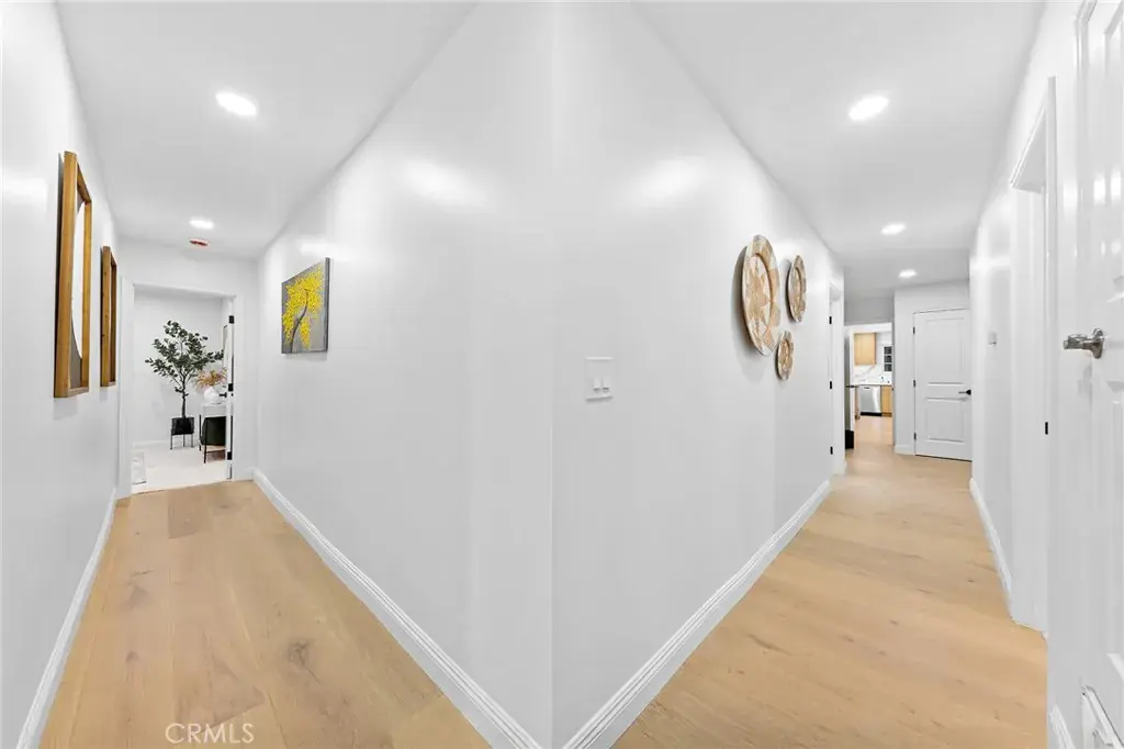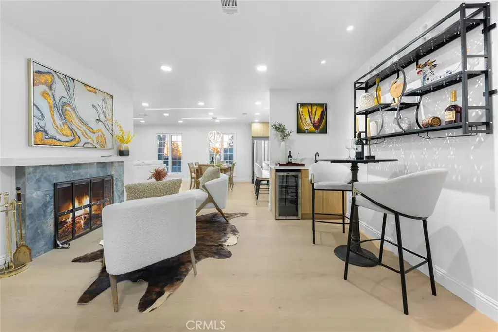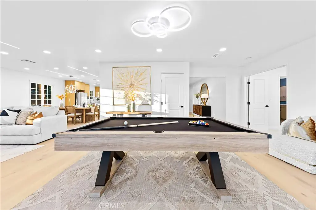 Inside, natural light fills the home, highlighting the brand-new 16mm engineered hardwood flooring and plush carpeting throughout. New drywall finished in a modern palette complement the home, with select interior walls removed and shear walls restructured to achieve the sense of openness and flow. The kitchen has been thoughtfully designed, featuring high-end appliances that blend seamlessly with the Euro-style cabinetry, with premium finishing throughout. New recessed lighting and updated fixtures throughout the home enhance the ambience and create a very vibrant living environment. Inside the primary suite, you’ll notice the spa-like bathroom featuring a spacious walk-in closet with soft lighting and custom built-in cabinetry. Both suites open directly to the newly landscaped yard, complete with a putting green and a gazebo that create a refined outdoor retreat, perfect for friends and family to enjoy.