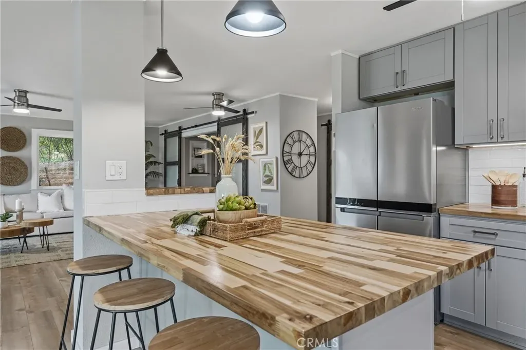 The kitchen has been completely redesigned and serves as the centerpiece of the home. It features custom cabinetry, stainless steel appliances, butcher block countertops, and a classic farmhouse sink. Whether you’re cooking a quiet dinner at home or hosting friends and family, the space is both functional and inviting.