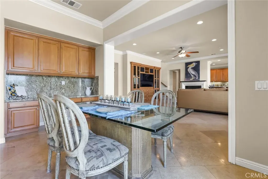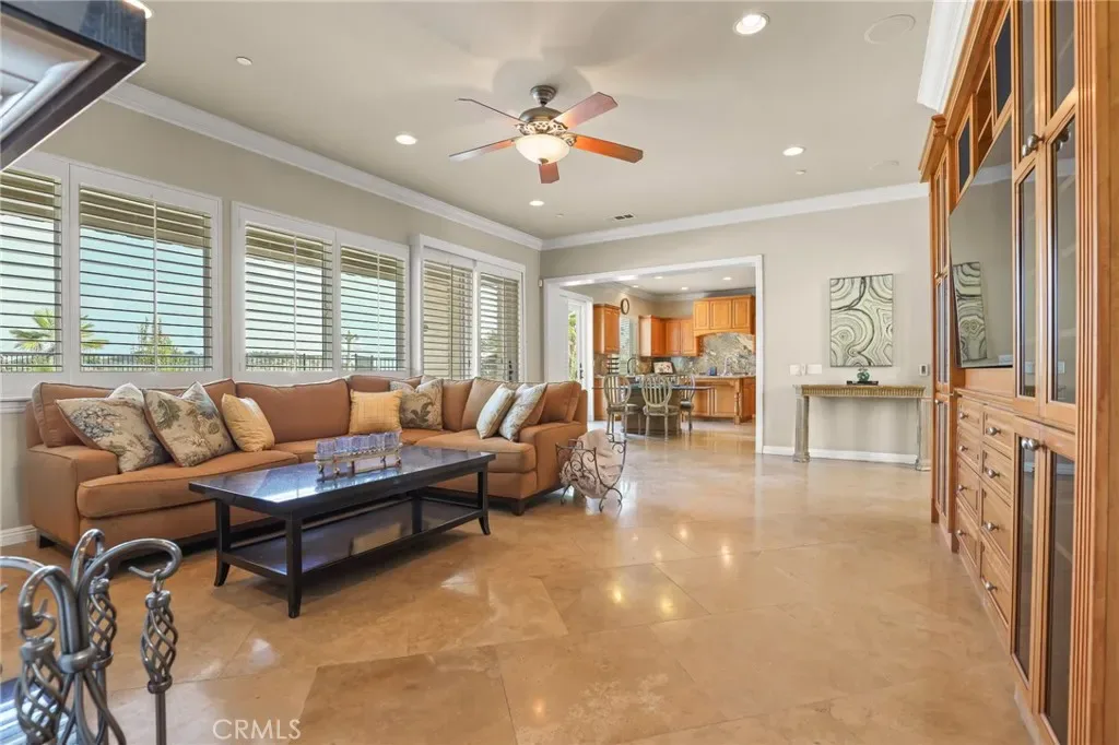 Step inside to rich architectural detail: travertine floors, plantation shutters, bespoke cabinetry, custom crown molding, and three fireplaces (including wood-burning for warmth and ambiance). The home is an entertainer’s dream with a striking built-in aquarium, wet bar, surround sound, intercom, custom entertainment centers, and a spacious upper-level lounge with balcony—perfect as a media/game room while soaking in the panoramic backdrop.