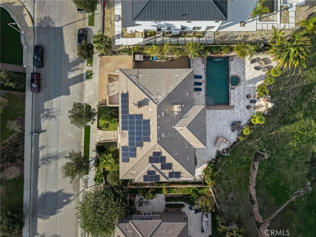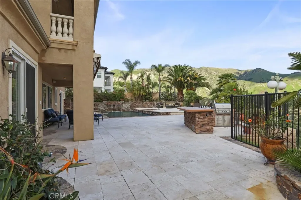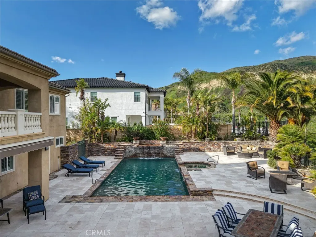 Outside, escape to your private resort-style yard featuring a sparkling pool and spa with cascading waterfalls, outdoor BBQ area and fireplace, and a large retractable awning for shaded comfort—all framed by dramatic mountain scenery. Additional highlights include fruit trees, RV/boat parking, an oversized 3-car garage with extensive storage and custom cabinetry, whole-home generator, and solar panels. Close to great schools including Granada Hills Charter High School, and convenient to The Vineyards and more.
