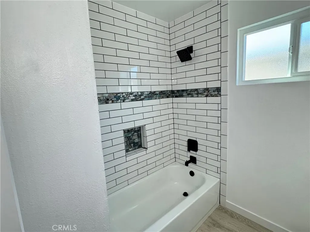 Both bathrooms have been fully upgraded with new vanities, fixtures, mirrors, lighting, and tile. The front bath offers a dual-sink vanity with a tub tiled to the ceiling, while the primary bath features a beautifully tiled floor-to-ceiling shower. Sleek black fixtures throughout complete the modern design.
