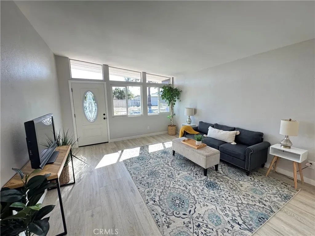 The remodeled kitchen has been thoughtfully redesigned and enhanced by removing the ceiling soffit to create a more open and airy feel. Features include soft-close cabinetry, quartz countertops, deep-set sink, Samsung appliance package (stove, refrigerator, dishwasher, microwave), recessed dimmable lighting, skylight, and a new dining area light fixture. Laminate flooring flows throughout the home, offering durability and easy maintenance.