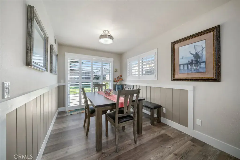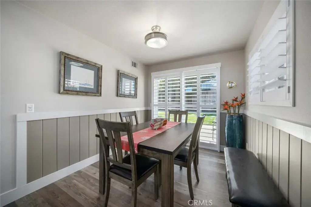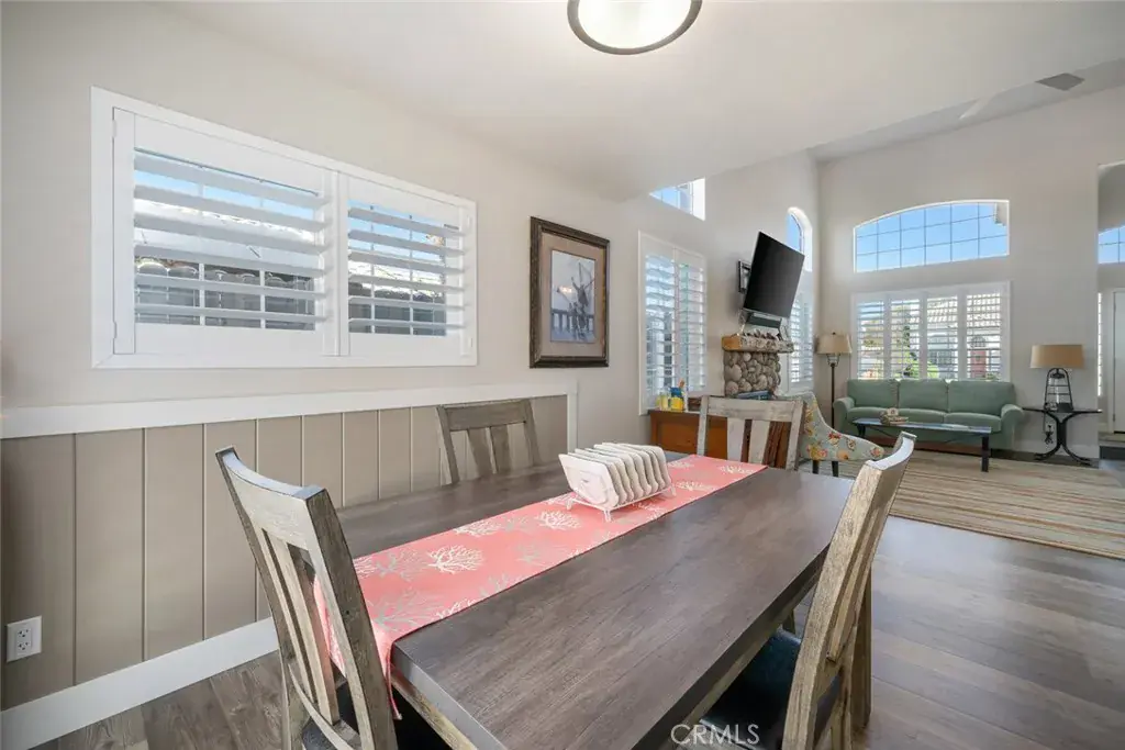 The elegant dining area flows seamlessly to the beautifully maintained backyard—perfect for entertaining with its concrete patio, lush grass lawn, privacy fencing, and manicured flower beds accented by mature trees.