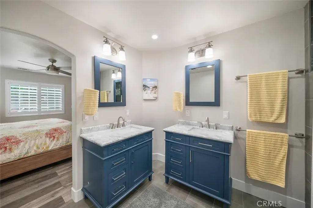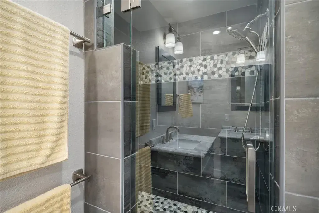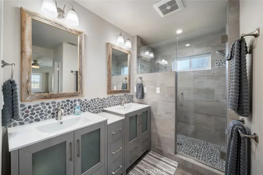 The upstairs primary suite includes an ensuite bath with dual vanities, a tiled walk-in shower, and a generous walk-in closet. The downstairs primary suite also boasts dual sinks and a custom stone-accented walk-in shower. Two additional bedrooms, one and a half bathrooms, and an indoor laundry room complete this versatile floor plan.