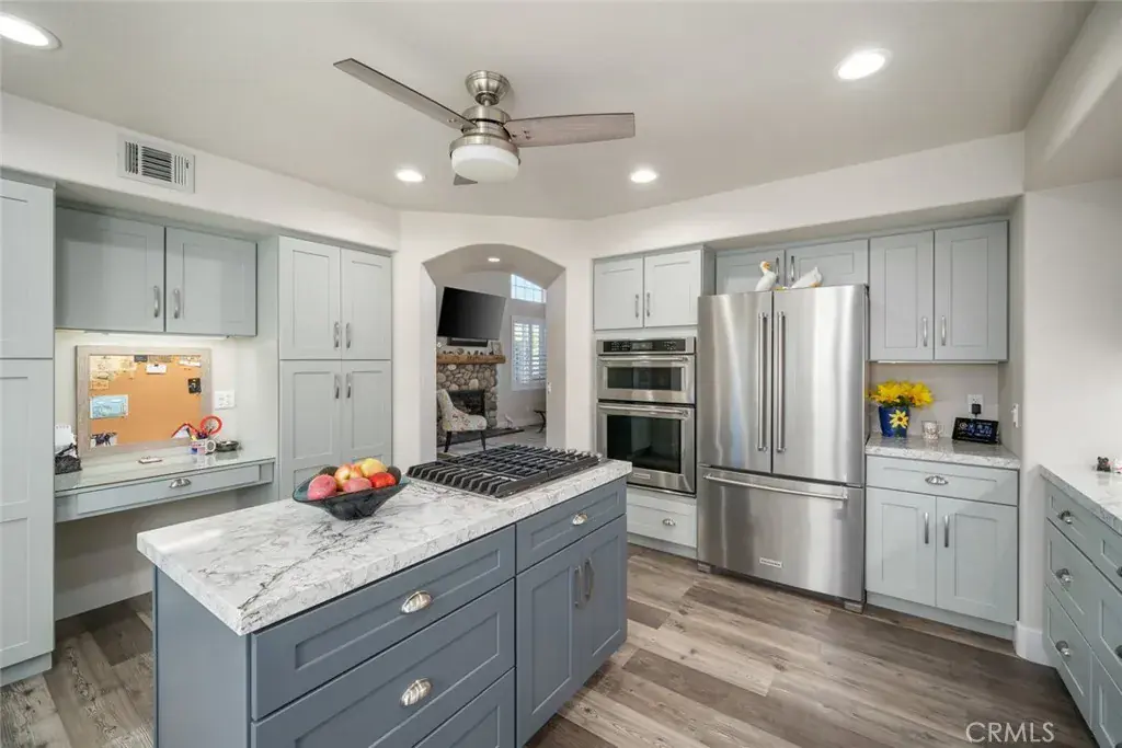 The kitchen offers abundant workspace with soft-close cabinetry, quartz countertops, a large island, and a built-in desk and pantry for extra storage. KitchenAid stainless steel appliances—including a gas range, microwave/oven combo, dishwasher, and refrigerator—add both style and functionality.