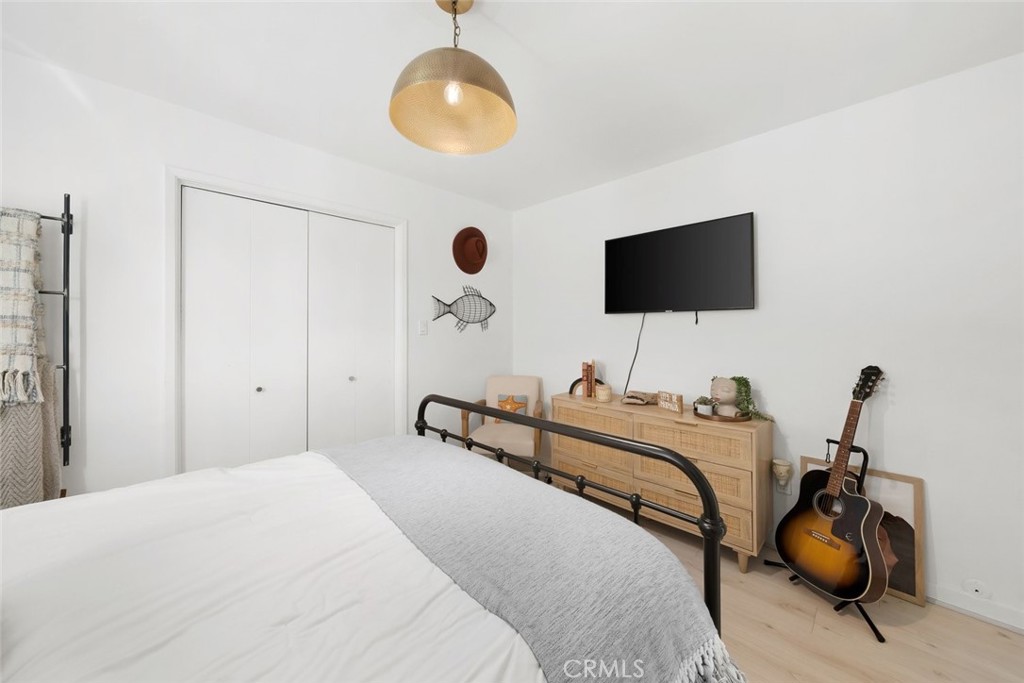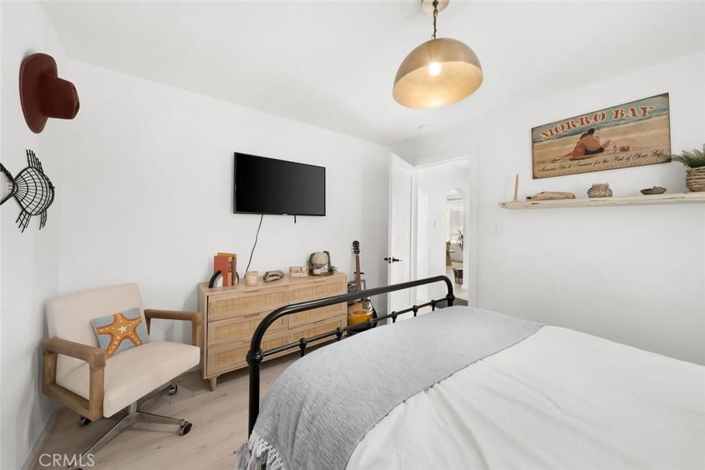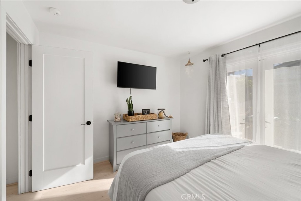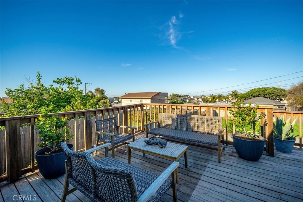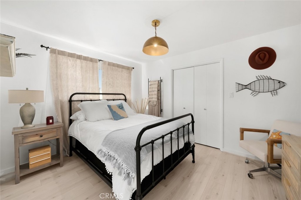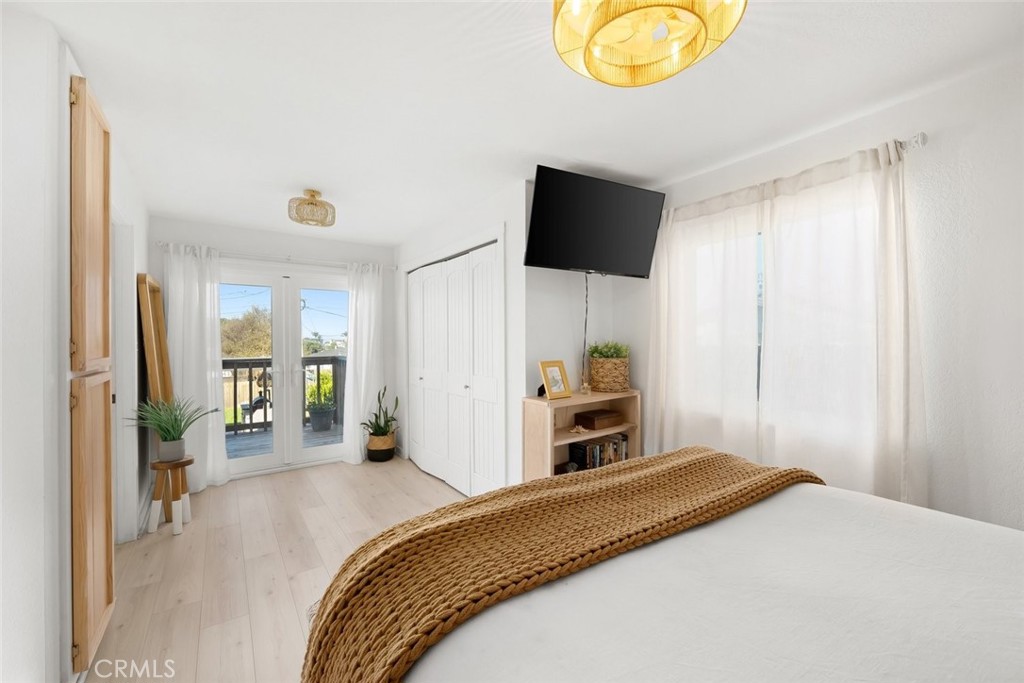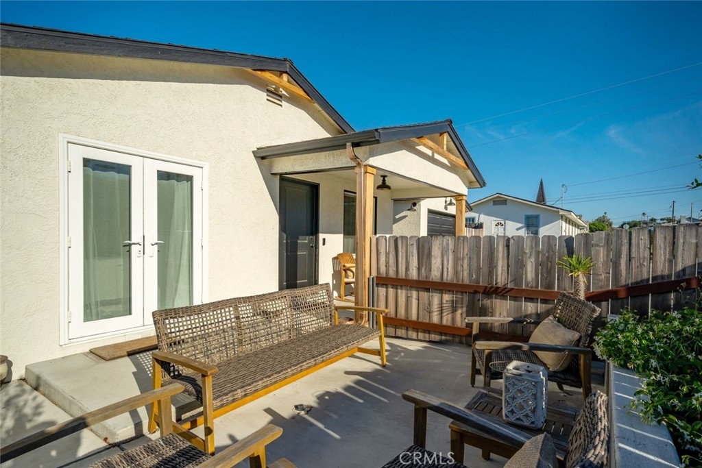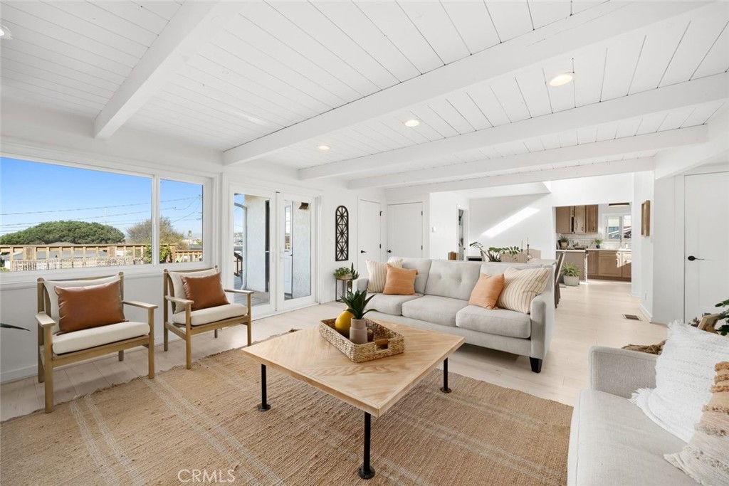 The back of the home opens up to a stunning flex space with its own private entrance—perfect as a guest suite, second living area, or oversized primary retreat. This inviting space showcases exposed wood beam ceilings, a cozy tile fireplace, and seamless indoor-outdoor flow to an expansive back deck. The generously sized back bedroom features new French doors and west-facing exposure, capturing ocean breezes and sunset light. An updated kitchenette with stainless steel appliances and subway tile backsplash adds even more convenience.