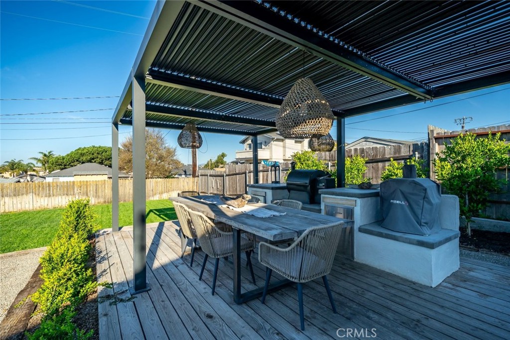 Outside is an entertainer’s dream backyard—featuring a covered dining patio, built-in BBQ area with smoker, warming drawer, and beverage refrigerator, plus a spacious seating area ideal for a fire pit. The lush lawn provides plenty of room for outdoor activities and relaxation.