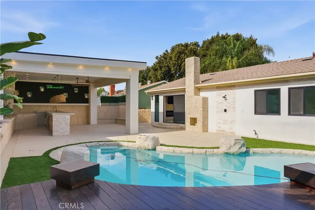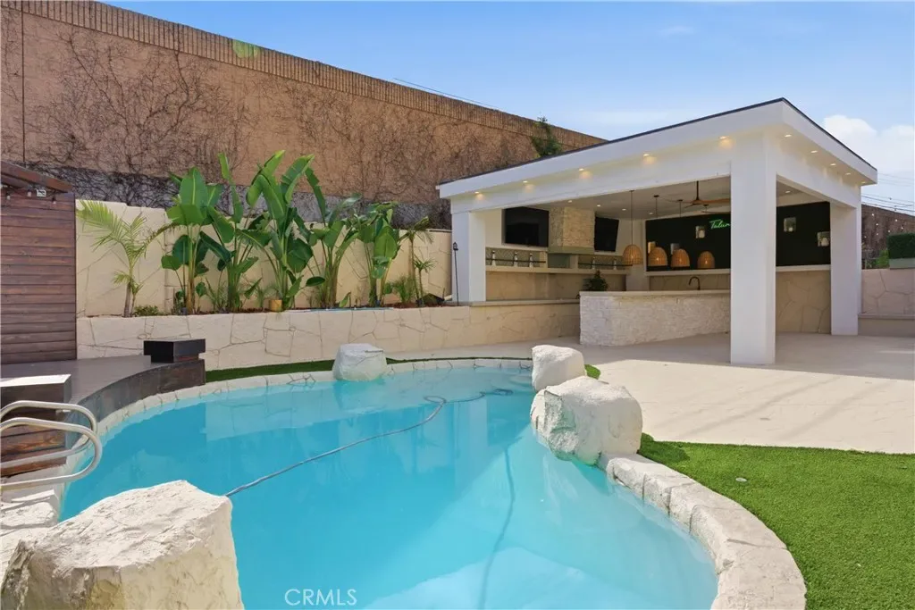 The outdoor living experience is equally remarkable, creating the feel of a private resort in your own backyard. Designed for both relaxation and entertaining, the grounds showcase a sparkling pool, an inviting sun deck, and a private covered patio that seamlessly extends the living space outdoors. The custom outdoor entertaining area is complete with a built-in sink, refrigerator, fire grill, and an expansive island, offering the perfect setting for intimate evenings or grand gatherings.