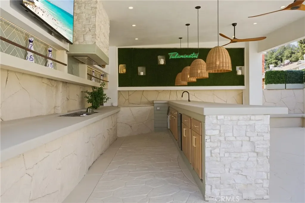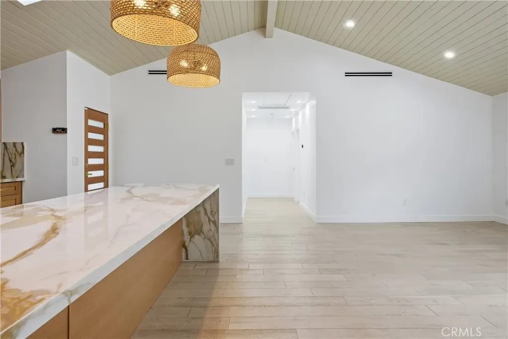 From the moment you enter, the home impresses with soaring vaulted ceilings, skylights, and an abundance of natural light that enhances the beautifully remodeled interior. Every detail has been carefully curated to reflect modern luxury, with refined finishes and tasteful upgrades carried throughout the home. The gourmet kitchen serves as a true centerpiece, featuring striking stone countertops, a designer backsplash, a farmhouse sink, and beautifully upgraded cabinetry with generous storage and style.